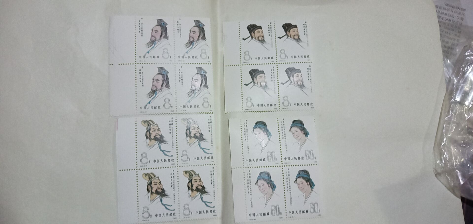以上都是原胶全品方联,都是自藏的雷锋70O元,五七干校厂铭带梅花800元,古代文学家8OO元