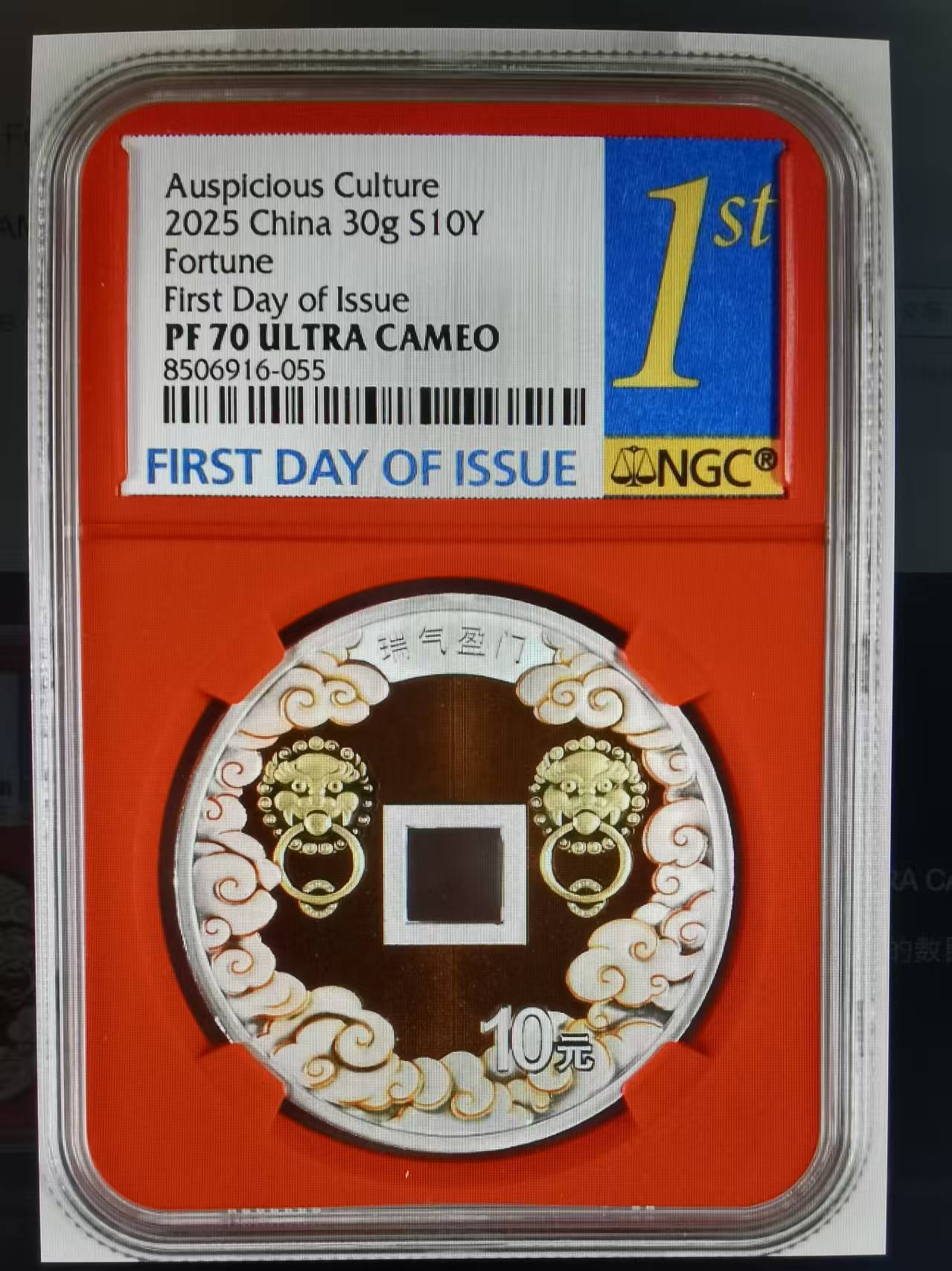 出售2025年吉祥文化瑞气盈门30克银币NGC评级首日金兰标70分靓号1枚(证书号:11011)