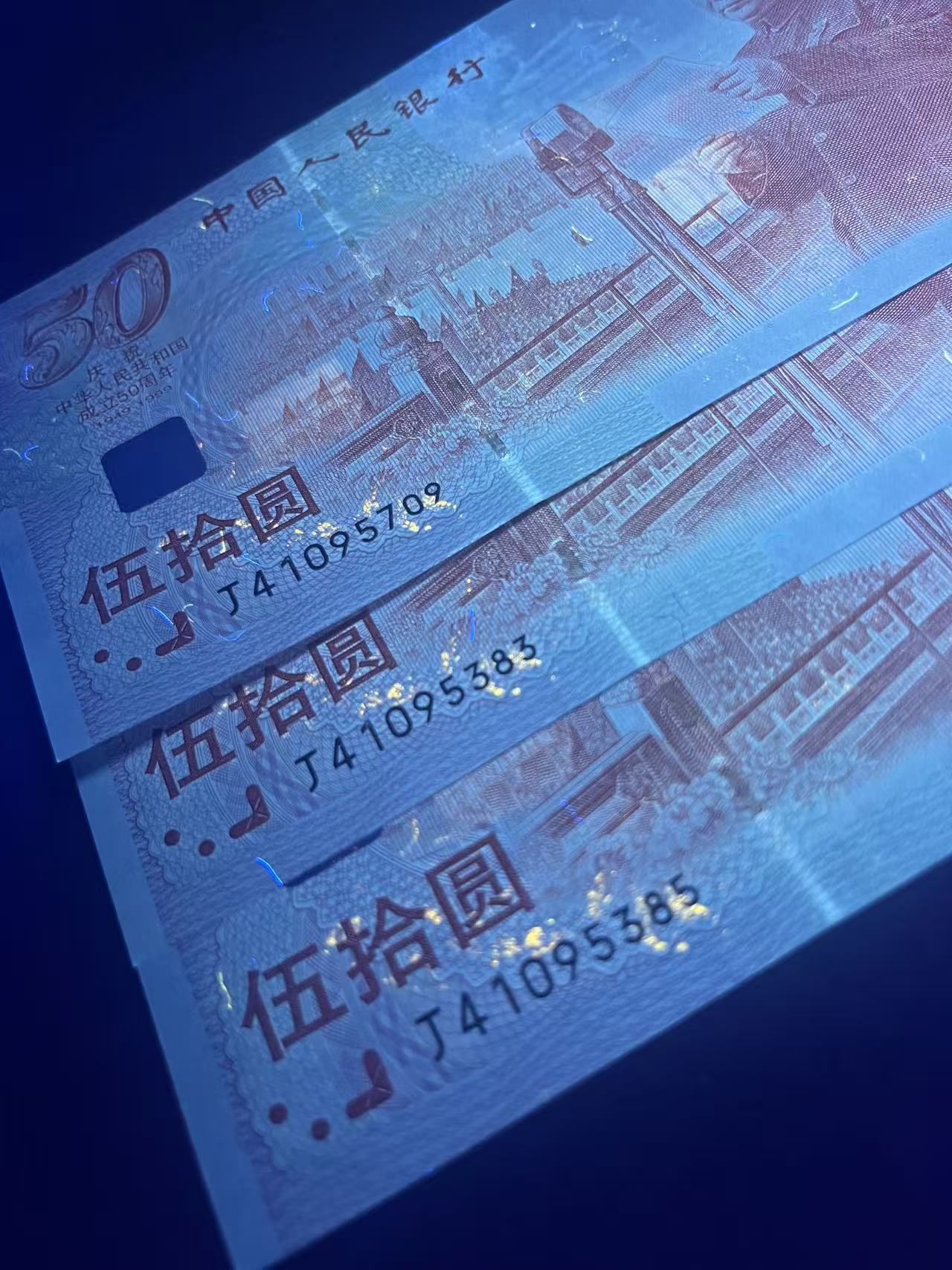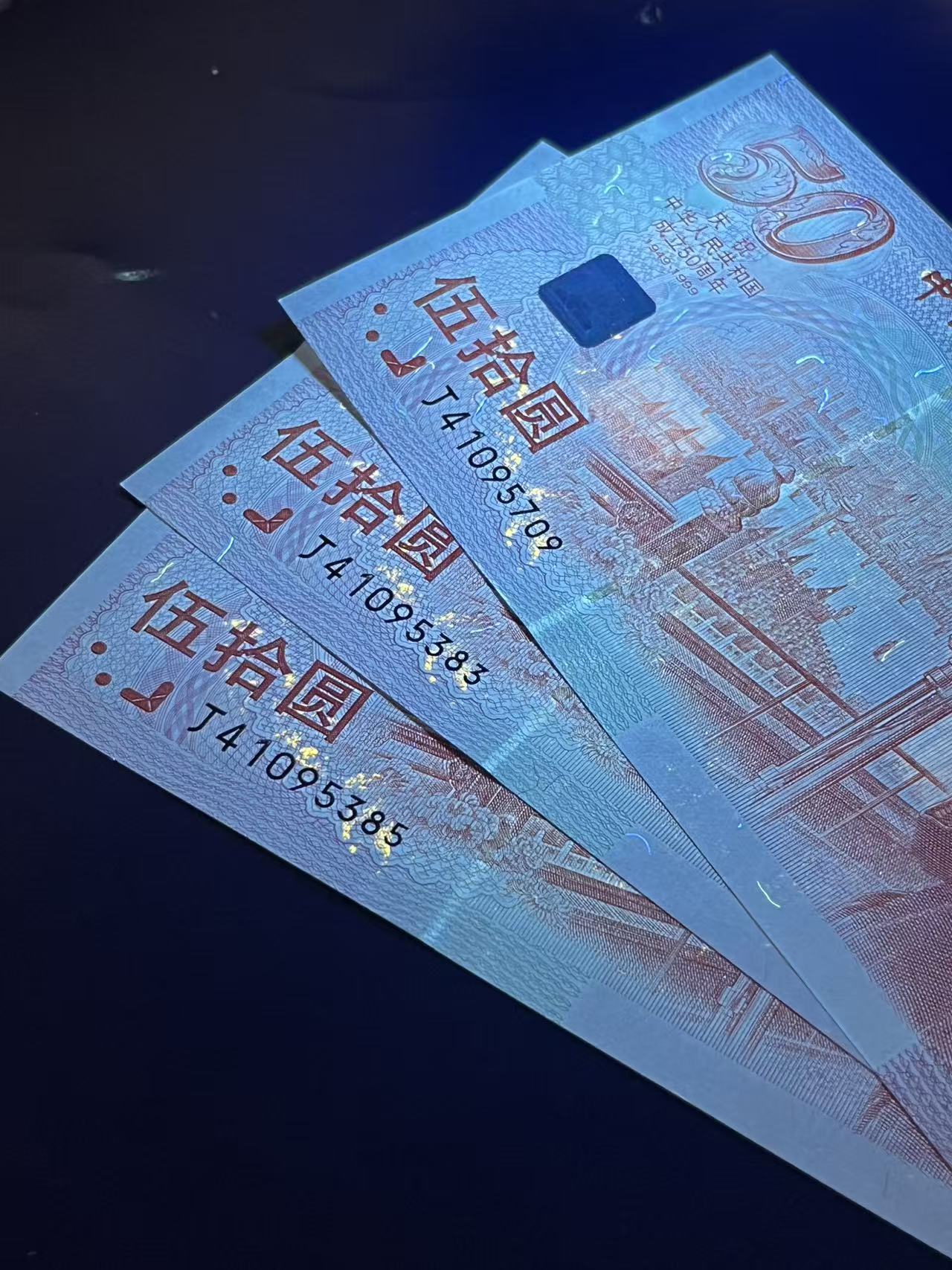 荧光建国钞(伍拾庆花)全新绝品三张