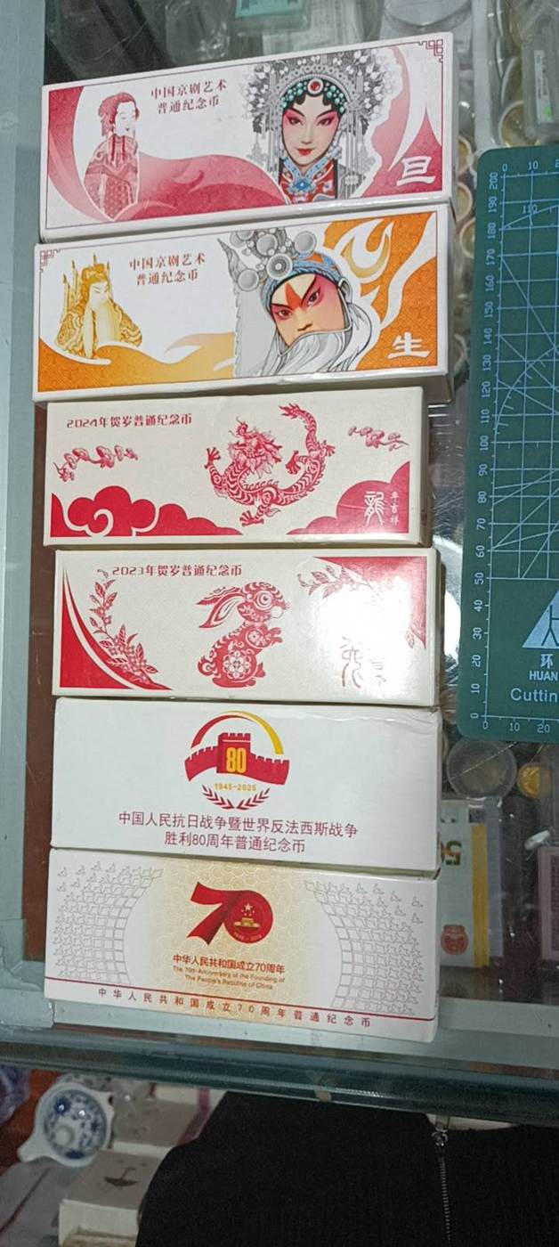 → 出二羊四盒箱拆货36/枚,二龙一盒23/枚,二兔一盒16.5,抗战一盒11.7,建国70周年11,京剧一11.2/枚,京剧二一盒6.2