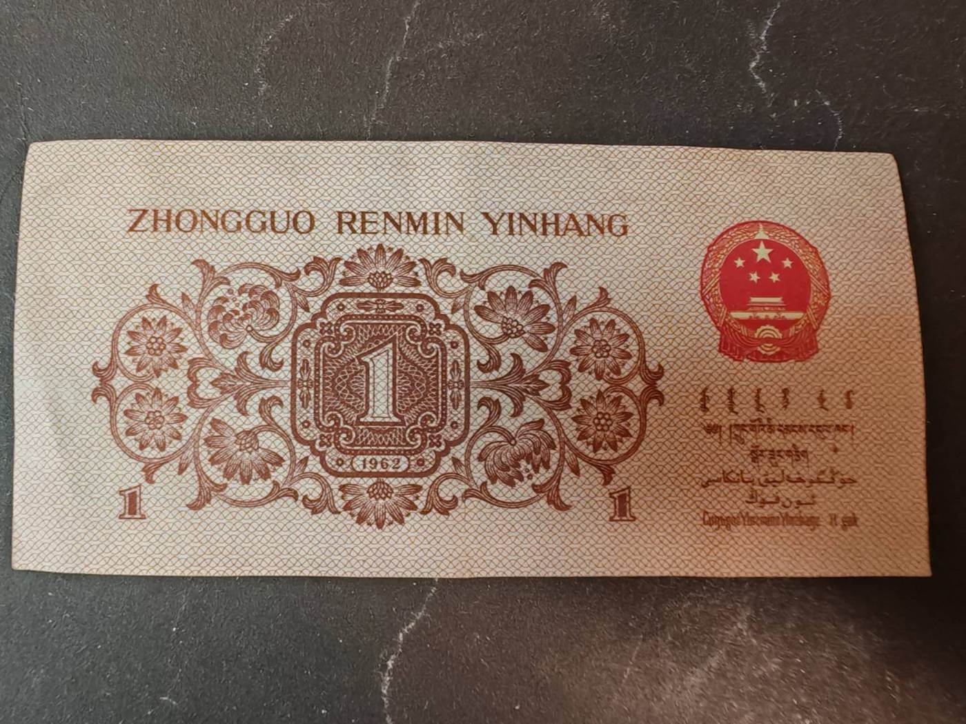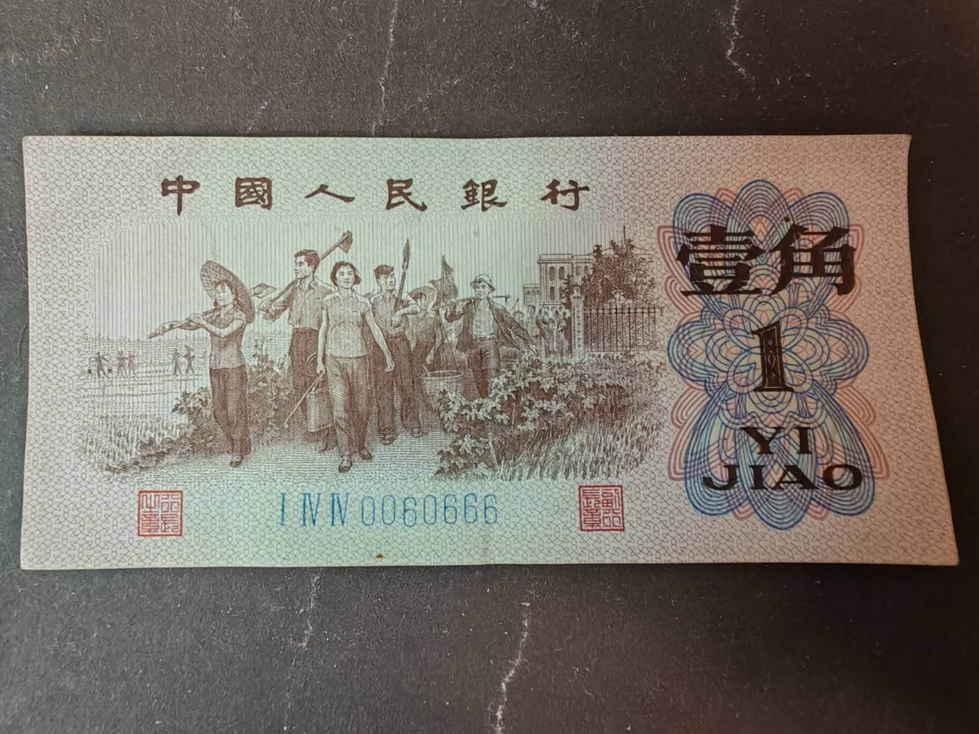 1962年一角,蓝3冠,人二,倒置圆圆号,尾666。 原票,220