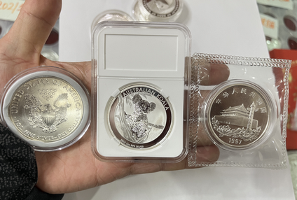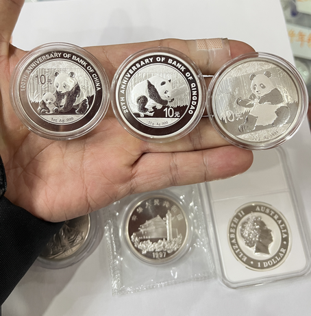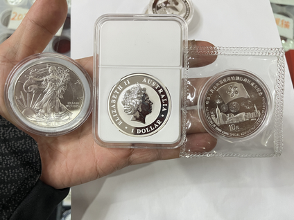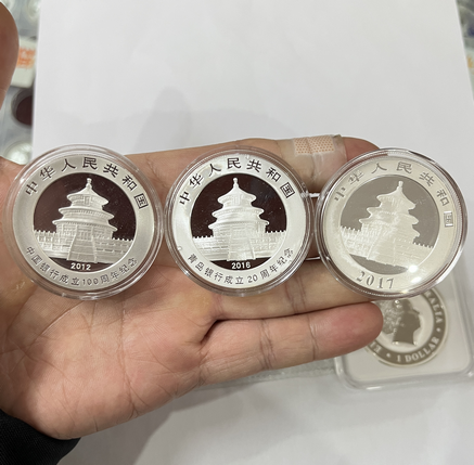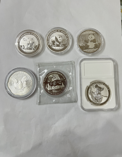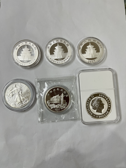 熊猫加字银币两枚,2017年银猫一枚,香港回归第三组银币一枚,考拉和鹰洋各一枚!
