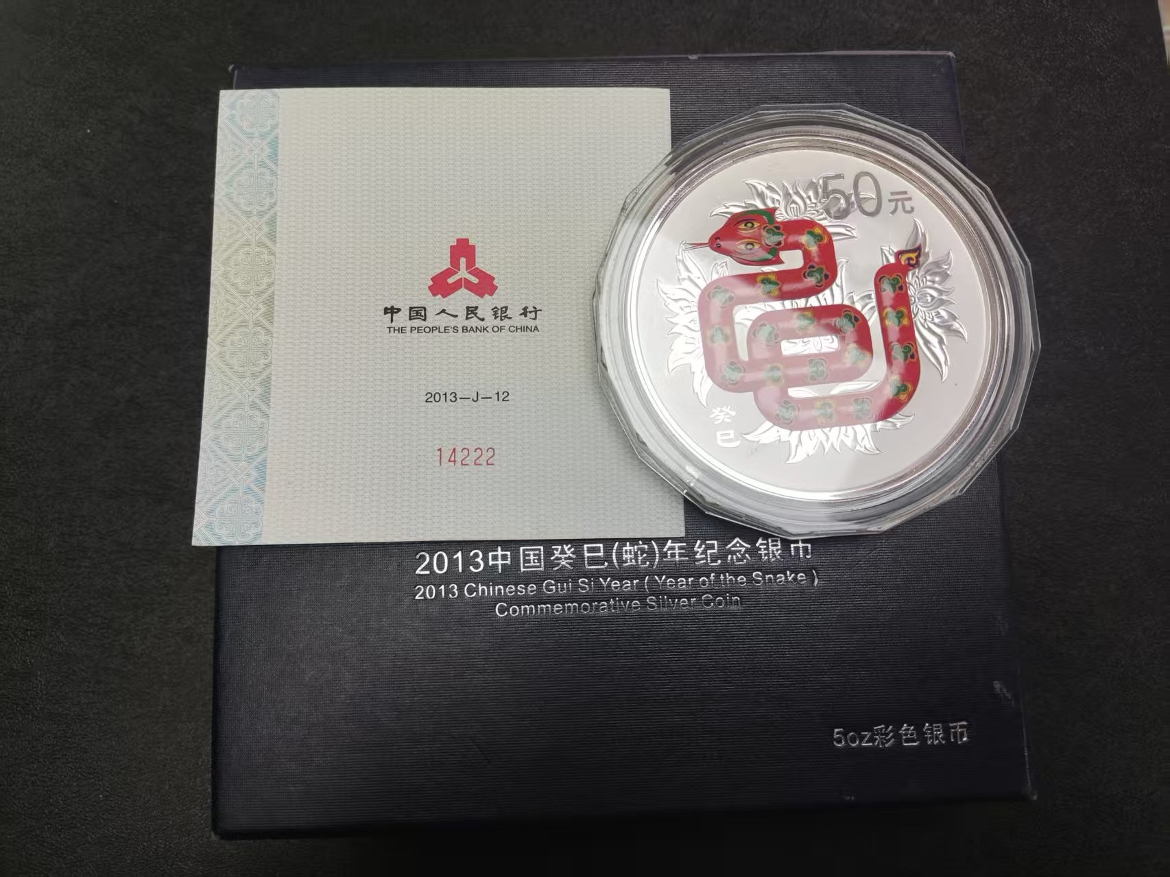 如图,13年5盎司彩银蛇,原盒原证(证书222),售3480元