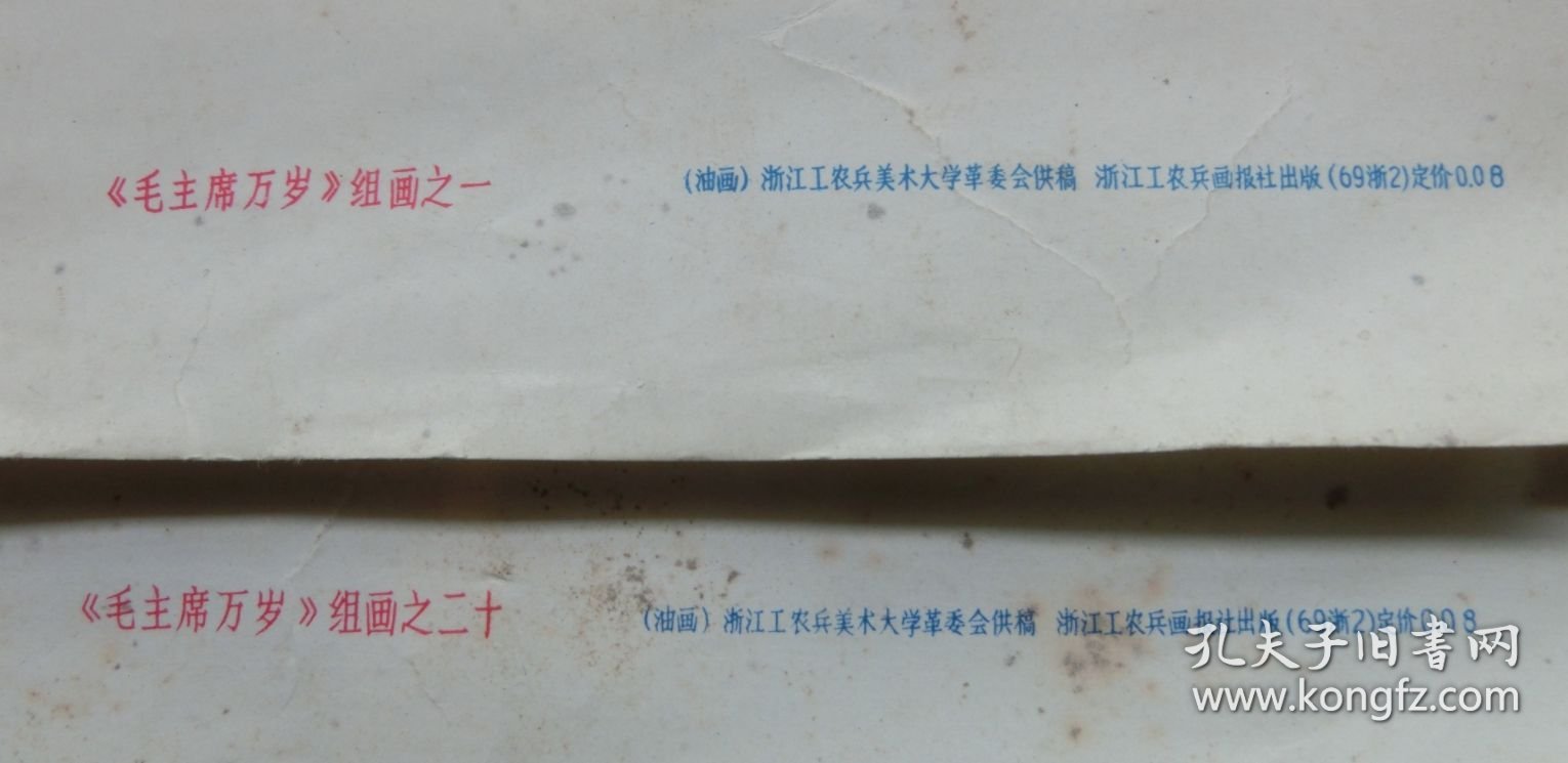 1969年、浙江工农兵美术大学供稿、毛主席万岁油画组画一套,单幅画长38.5厘米、宽26厘米,20张一套(每张都有编号),函括了主席从青年时代至文革早期最典型的形象画像,文革时期悬挂在(浙江工农兵美术大学即现代的浙江美术学院)玻璃橱窗里的产物,品质保证,20张齐全,整套实价2280元。