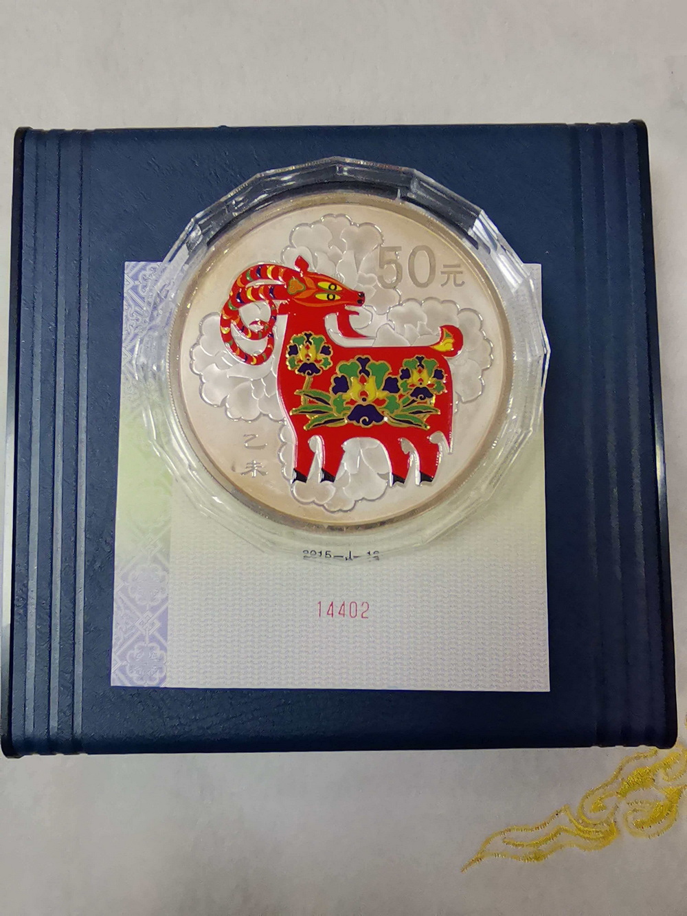 售:15年150克彩银羊,一枚,证盒齐全,有轻度氧化,号码14402,3800元/枚,三包。