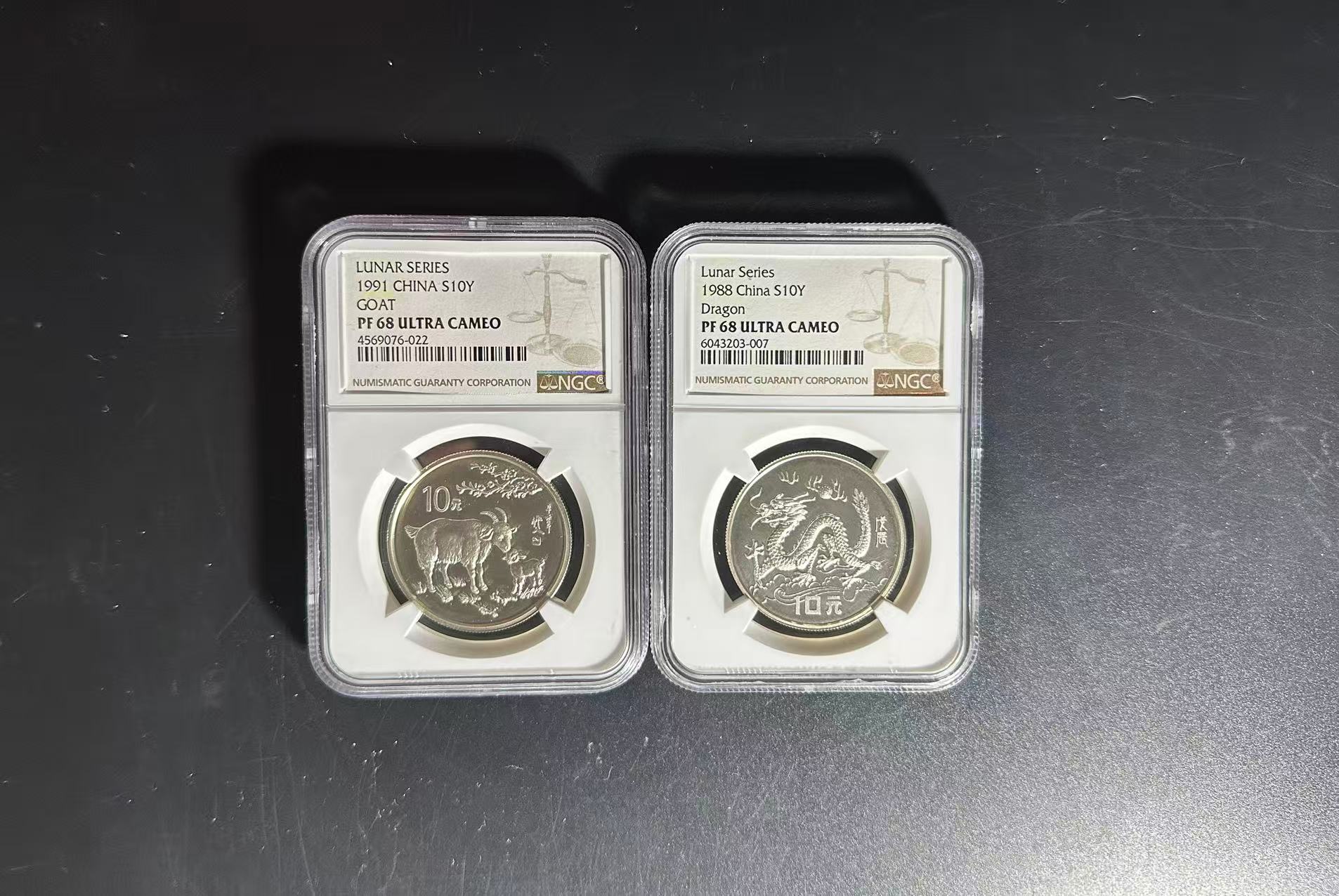 售:88年15克本银龙,91年15克本银羊各一枚,都是NGC68分,88年龙,没有证书,1700元/枚;91年羊有证书,号码0008536,900元,三包。