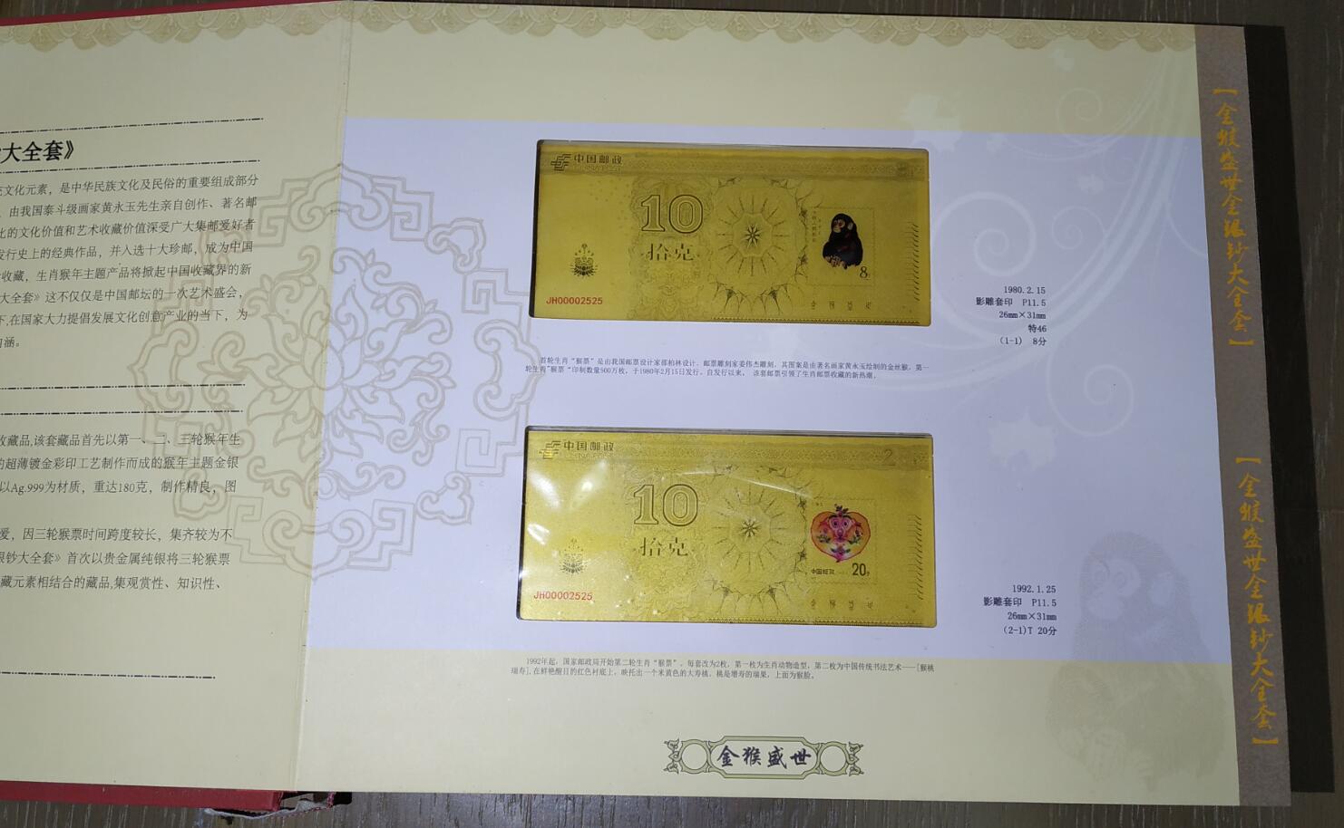金猴盛世镀金银钞大全套,10克银钞12张,5克银章12枚,共180克,一套带证书的已售,剩下这一套没证书。