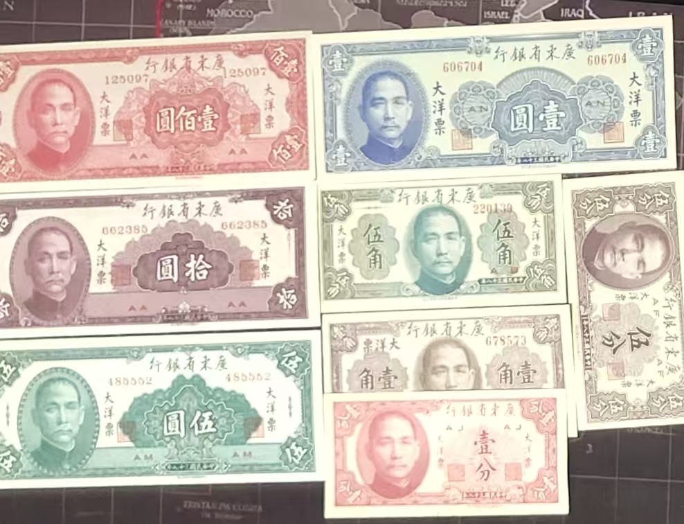 大洋票,壹佰元,拾元,伍元,壹元,伍角,壹角,伍分,壹分,各一张,每套260元,