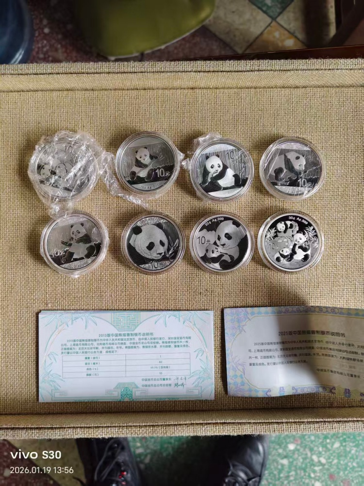 13.14.15.16.17.18.19.25.年熊猫币各一枚,共8枚,少19年证书,有的有轻微氧化,13.14.15售700元一枚,其它售680元一枚,一起5500元包顺丰。