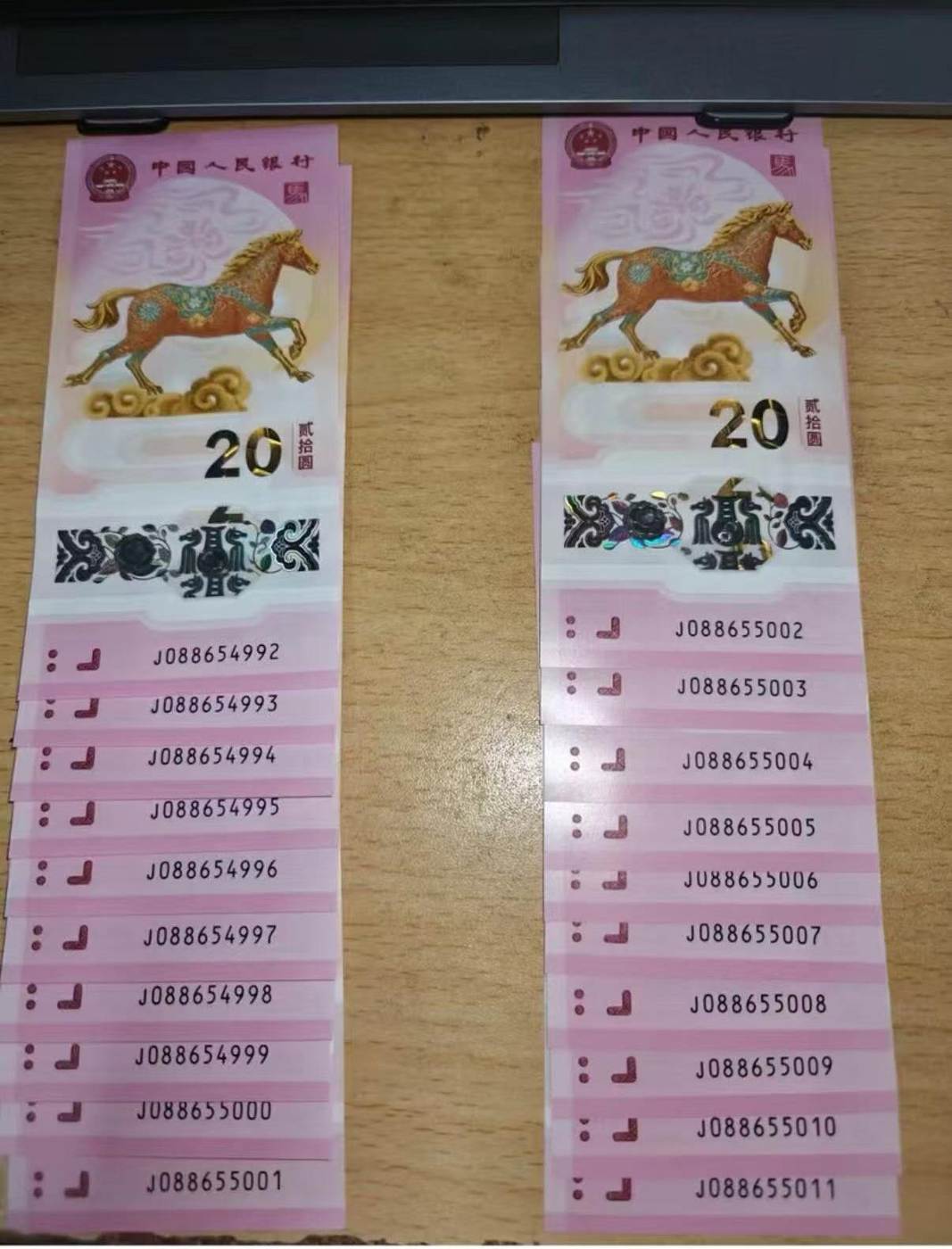 马钞金马王二十连,号码为088654992-088655011