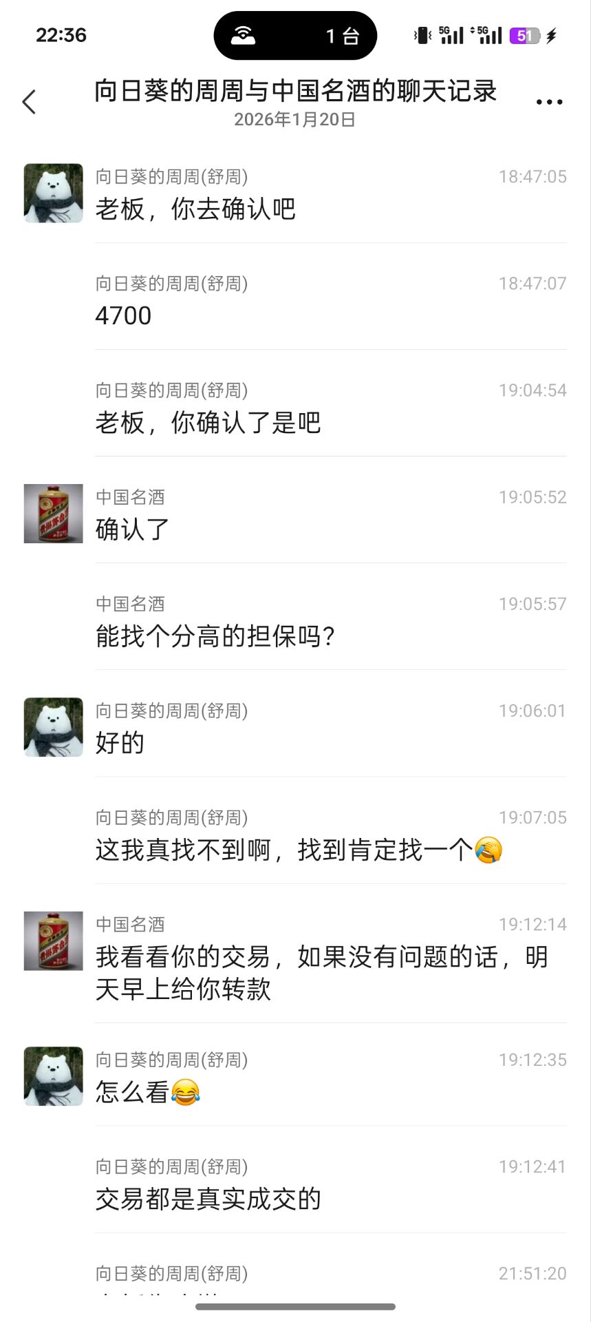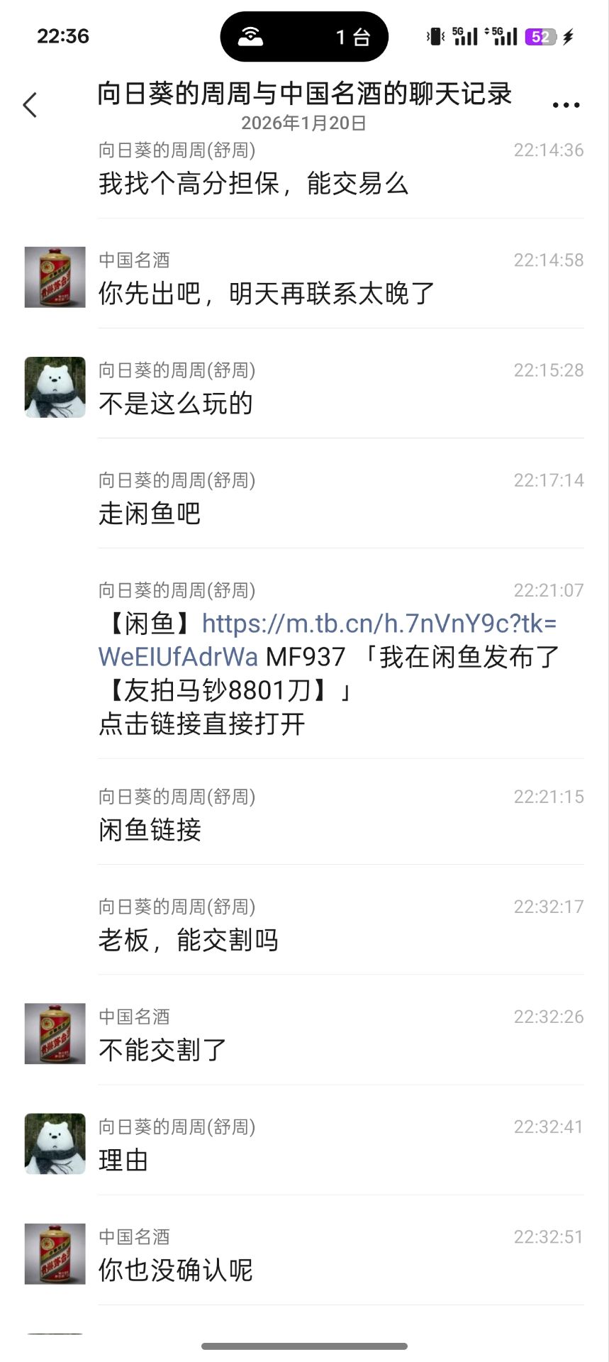 投诉一尘名 “弘化” 宋青军 13840934684 :今晚六点多微信联系我4700元确认马钞标百8801,九点二十多跌价后偷偷撤回,又以我分低不放心直款为由,我发去某鱼链接后直接摆明不交割。