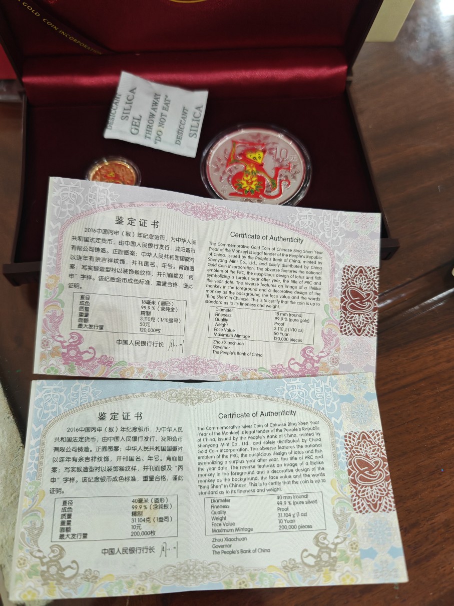 如图:本色和彩色金银猴各1套,证盒齐,金重6.22克x1060=6593,银重62.2克x23.5=1462,齐出855元包邮。