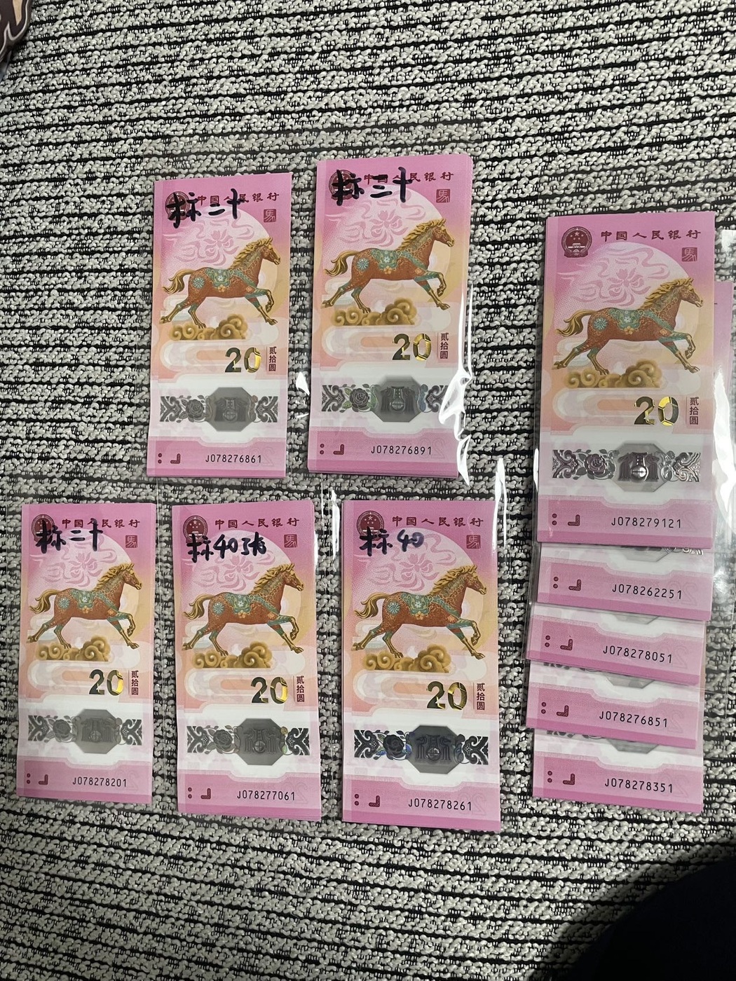 出售无3、4马钞标十20组,有标十、标20,标30,标40,如图,一起走20组,单价39,合计7800,三包顺丰。