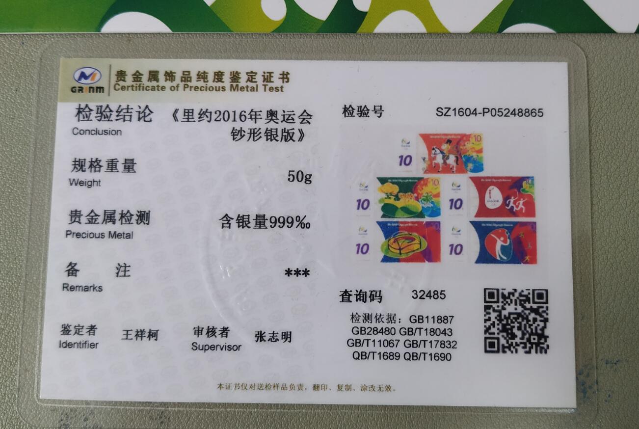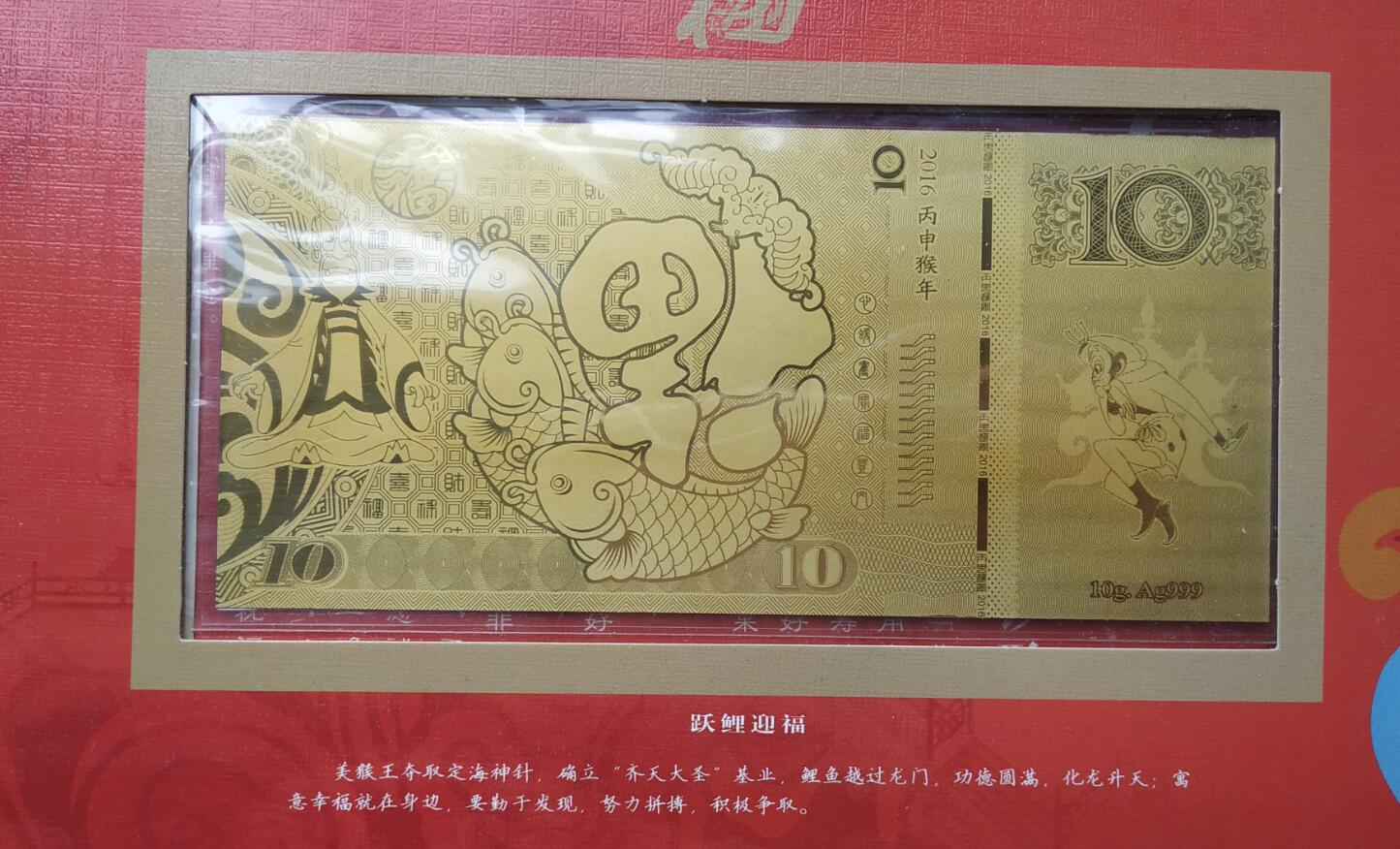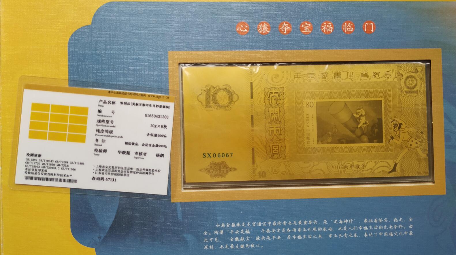 美猴王猴年生肖钞6张,每张10克。里约2016年奥运会银钞5张,每张10克。两套一共110克,克价23元。带证书和发 票。