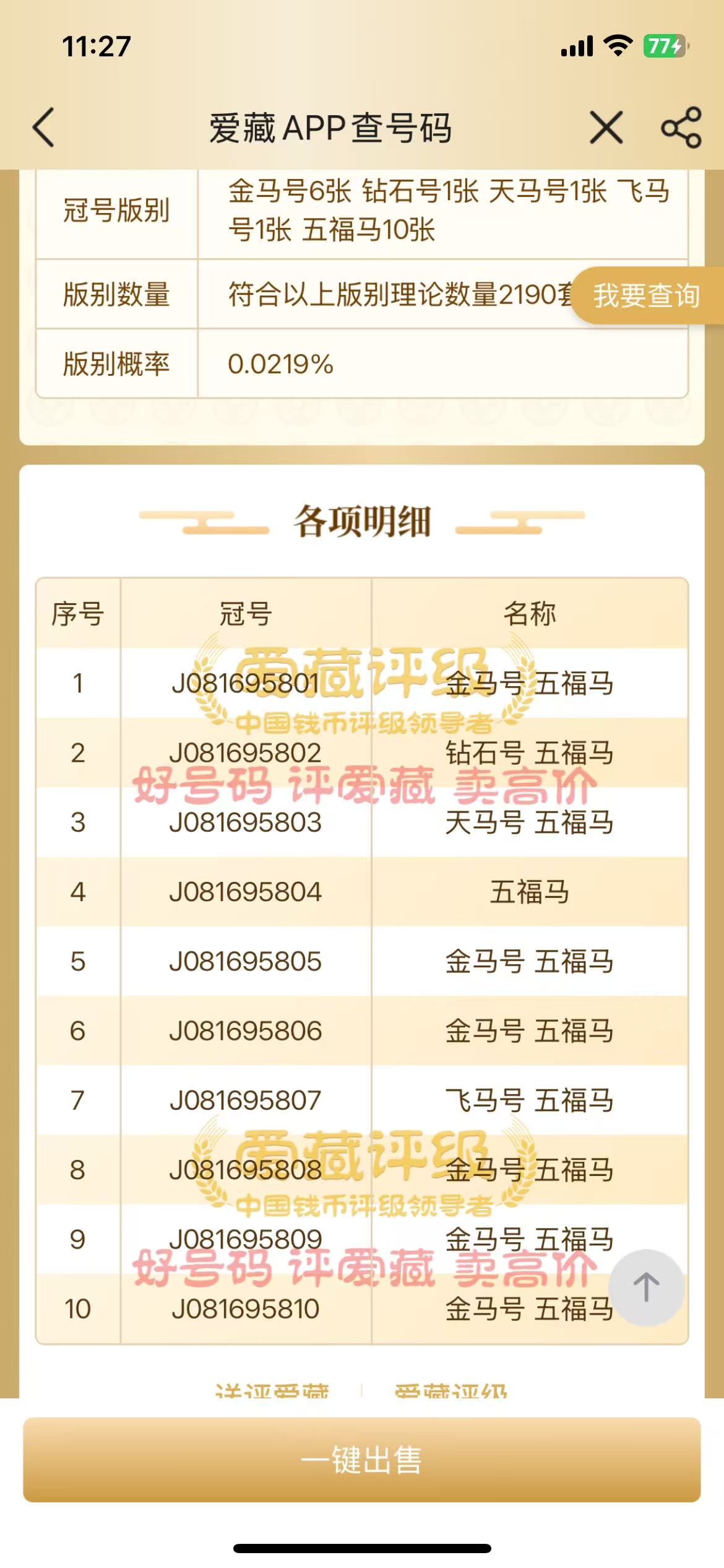2588出一组五福金马号标十马钞 081695801-810 款到发货