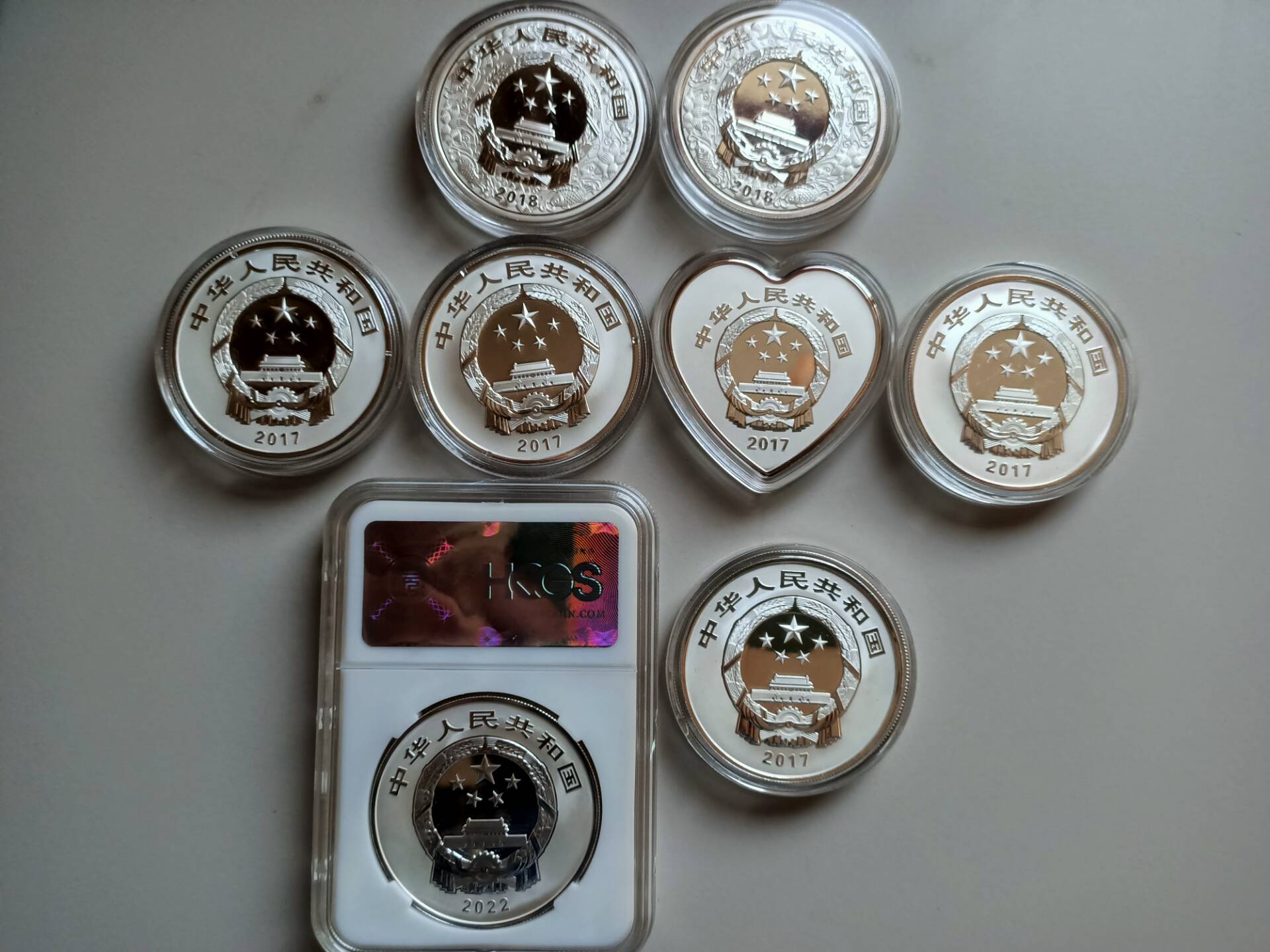 30克银币8枚,2017年吉祥文化4个一套,2018年狗年生肖本色、彩银各一个,2017年孔子银币一个,2022年封装泉州银币一个,泉州银币有证书无原盒,其余原盒原证书,泉州银币有轻微白斑点,其余7个正反面镜面效果,有两个边缘极微泛红,品相如实描述,710×8=5680元包邮!多渠道出售,购买需前提前联系!
