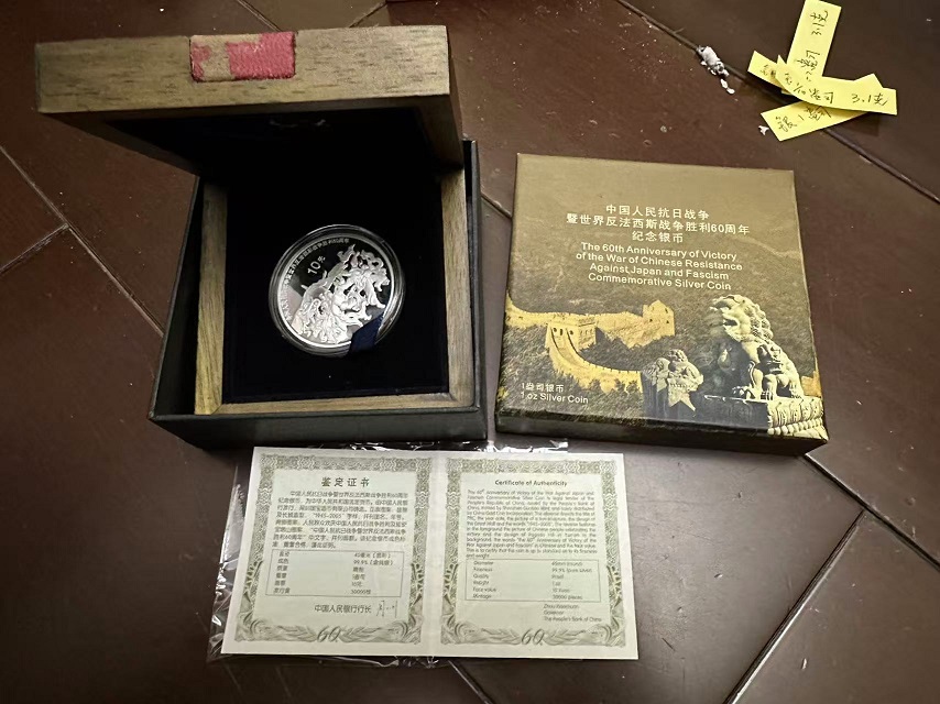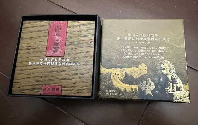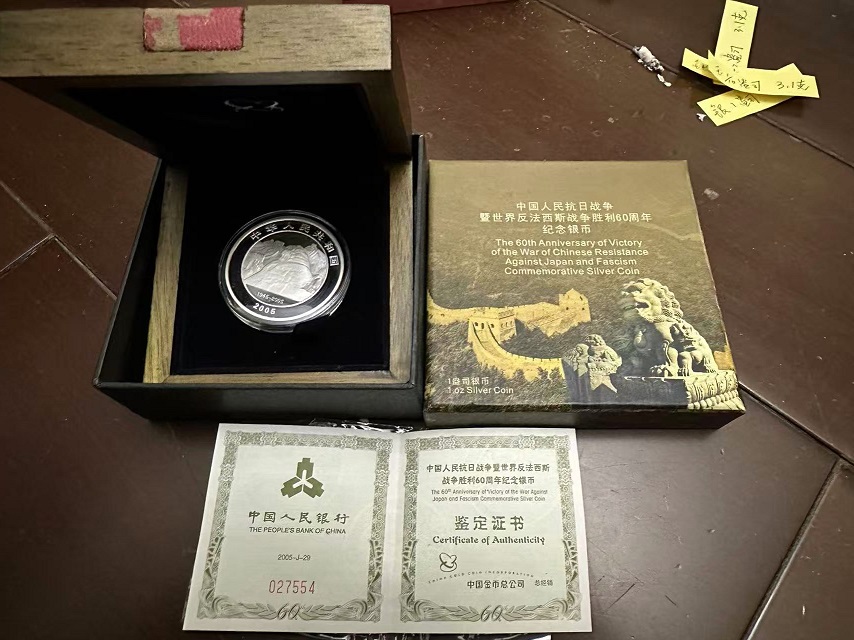 → 售05年抗战60周年银币1枚,品相绝