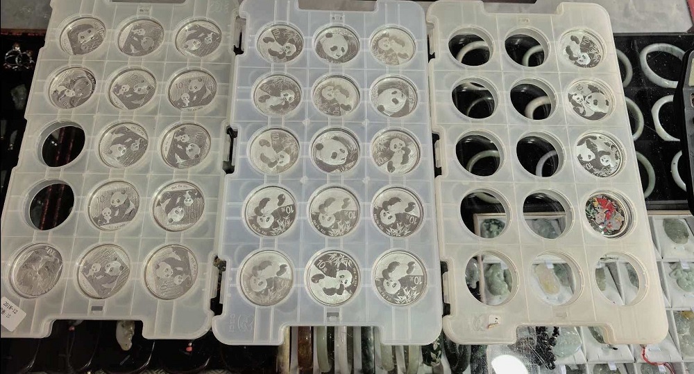 出一枚公斤水浒银币27000/枚,5盎司熊猫银币2枚4000/枚。