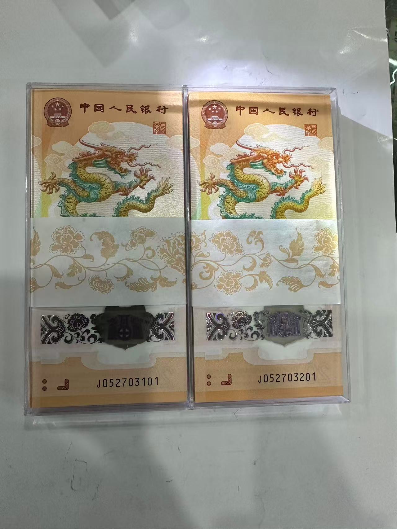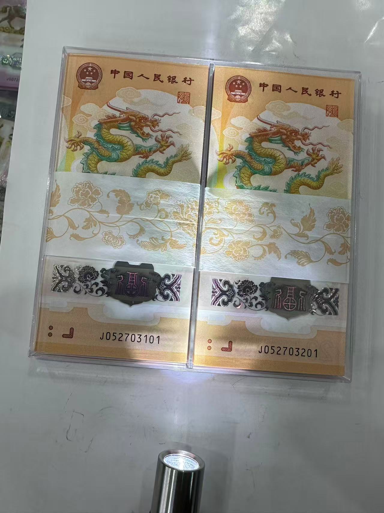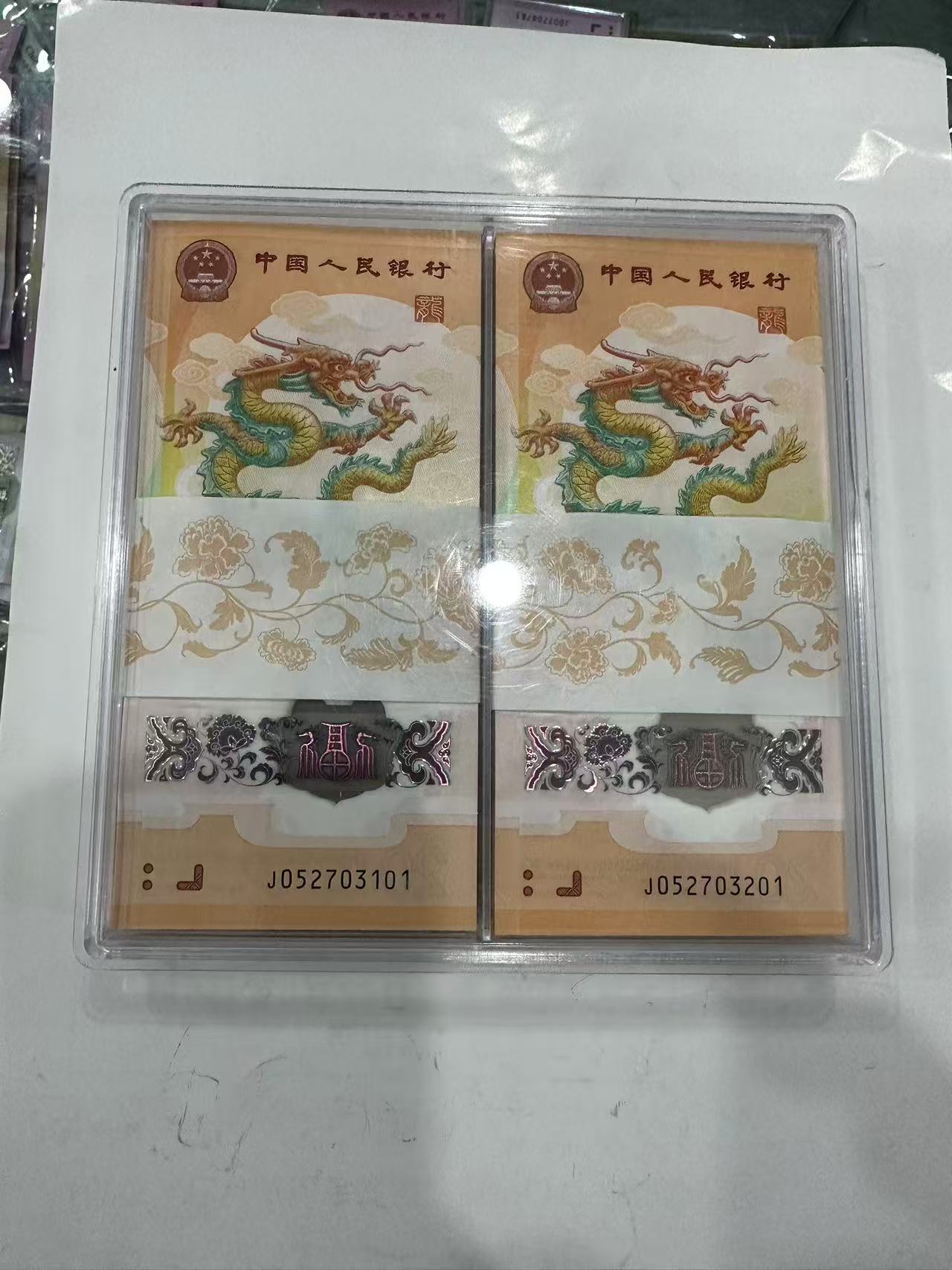 快出小龙钞3刀,一刀带狮子号4444爱藏67+,早期严评货。另两刀无4两百张连号,原始收藏品,无任何评级,尾201刀前三张龙爪处有轻微腰条勒痕。