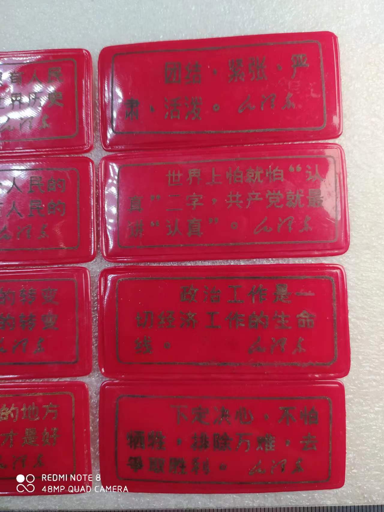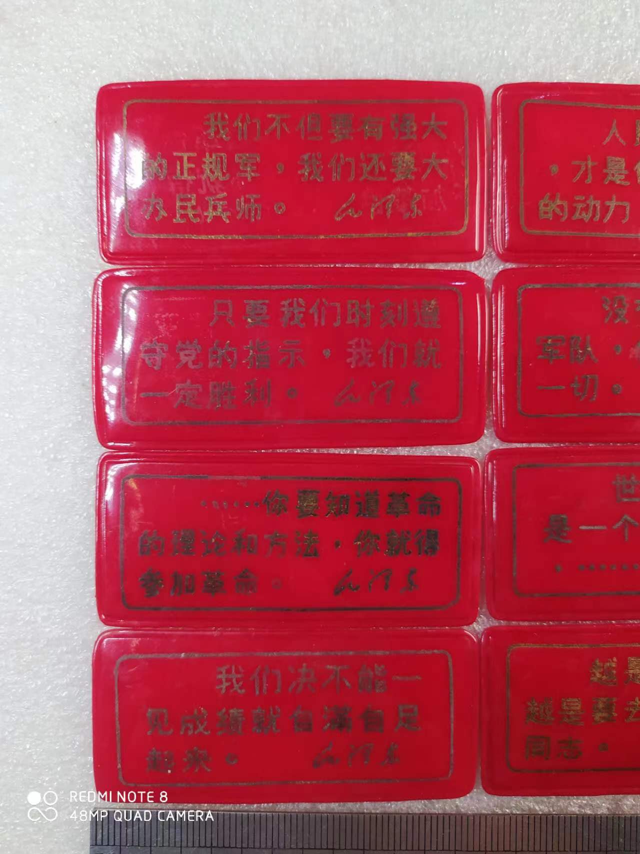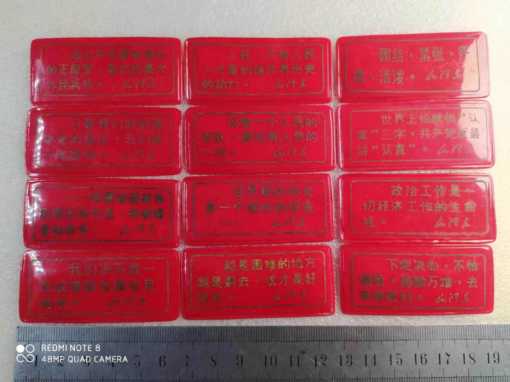 毛主席经典语录塑料牌,时间长了金粉字体有变色现象,介意的请别拍,长6.35厘米,宽2.85厘米,12张不同一组110元包邮中通快递。