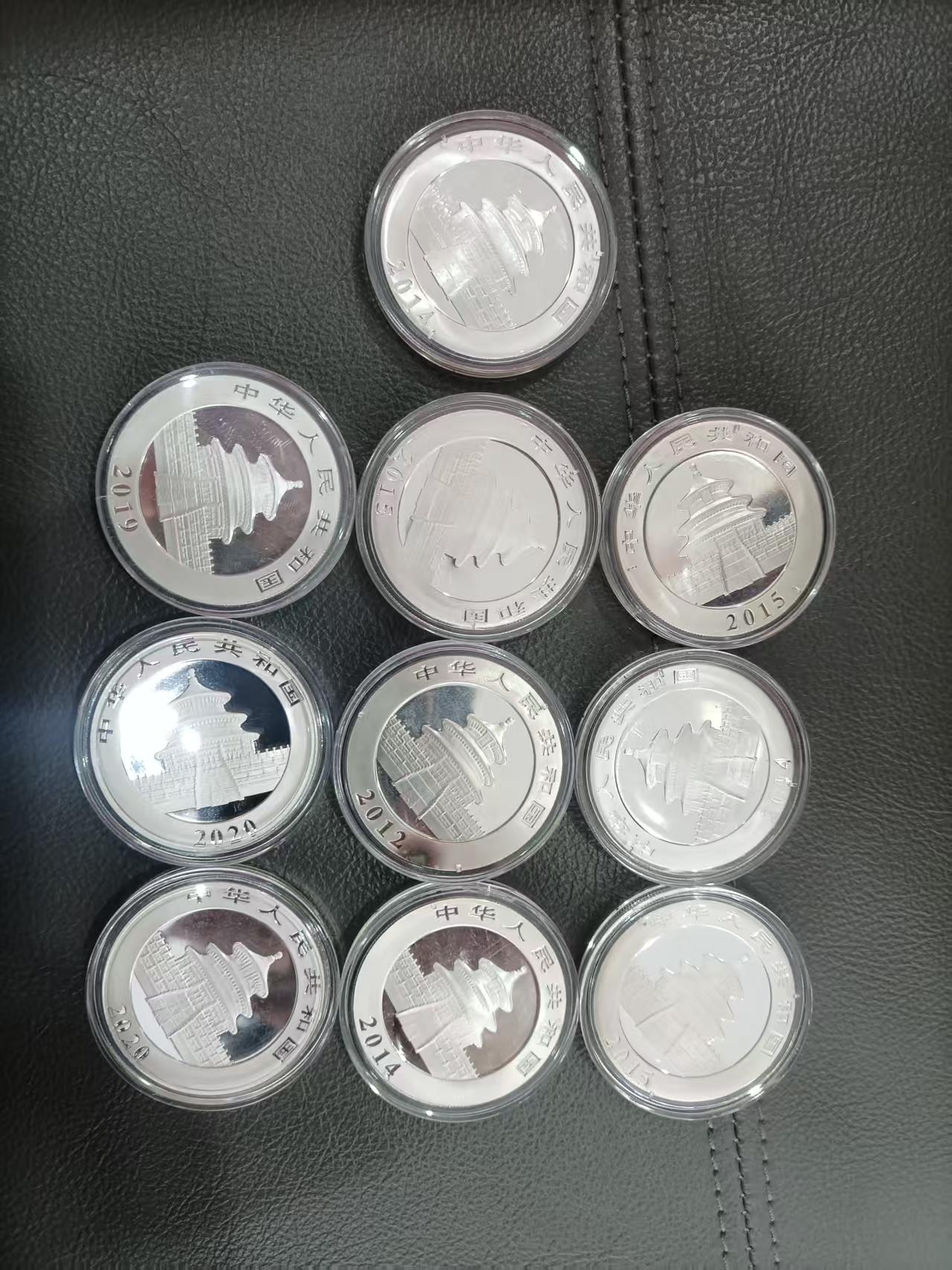 出熊猫银币10枚,一盎司的7枚,780元一枚,30克的3枚,750元一枚,一枚氧化,其他的全品,一起出三包顺丰。