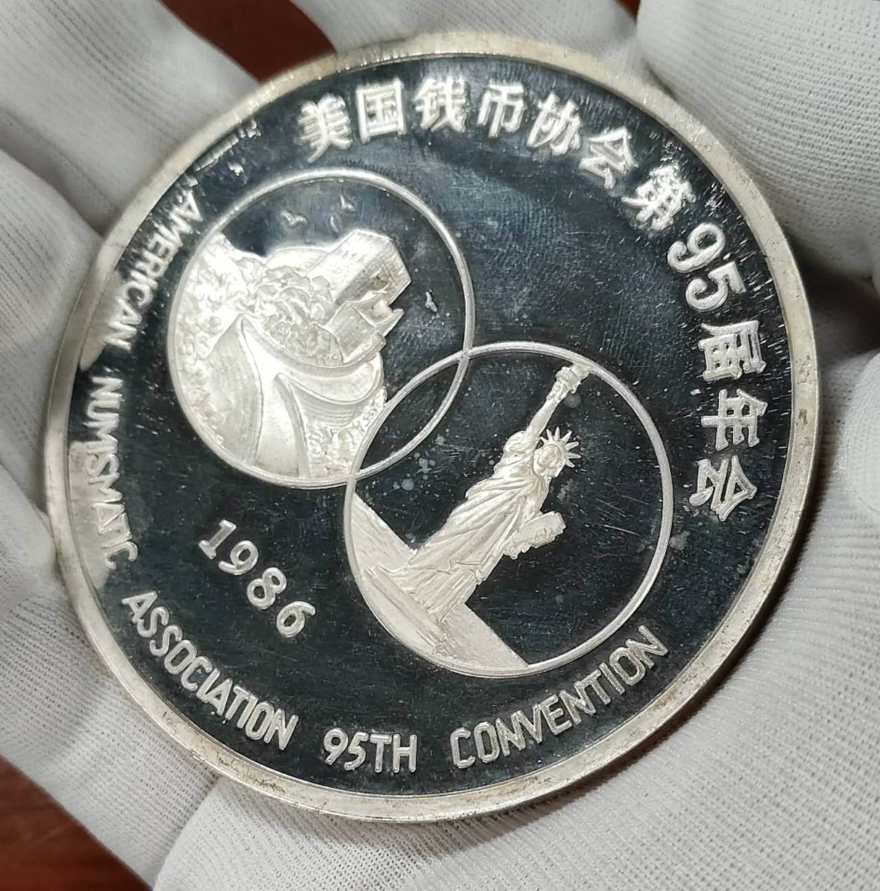 中国造币公司铸造发行★中美钱币协会95届交流年会(1986)纪念纯银银章(5Oz--五盎司Ag999)。Ag99.99纯银铸造,法定重量五盎司(155.52克),银章无磕碰,有轻微划痕,永久保真。如图发货三包。