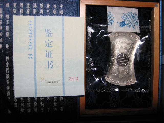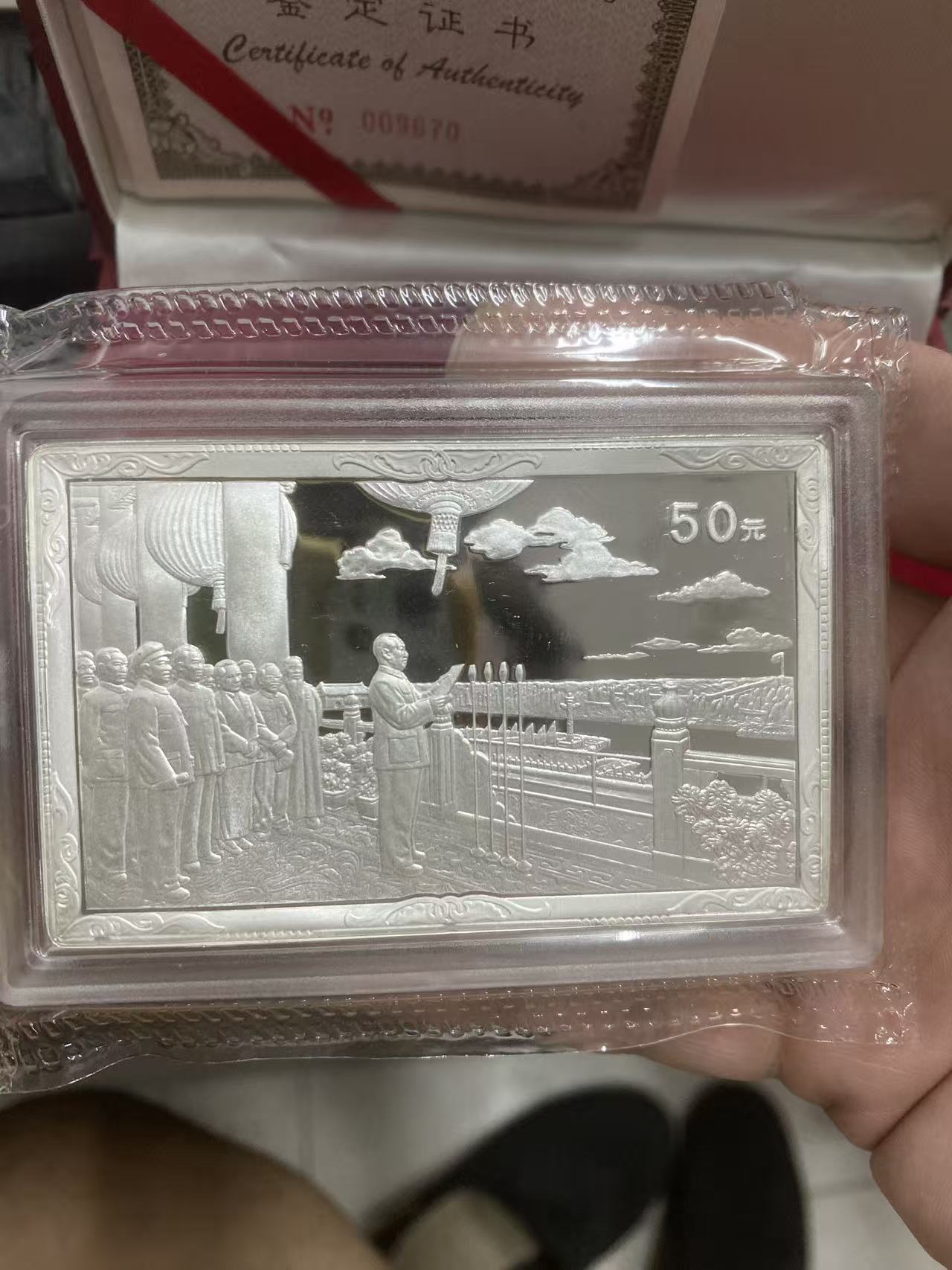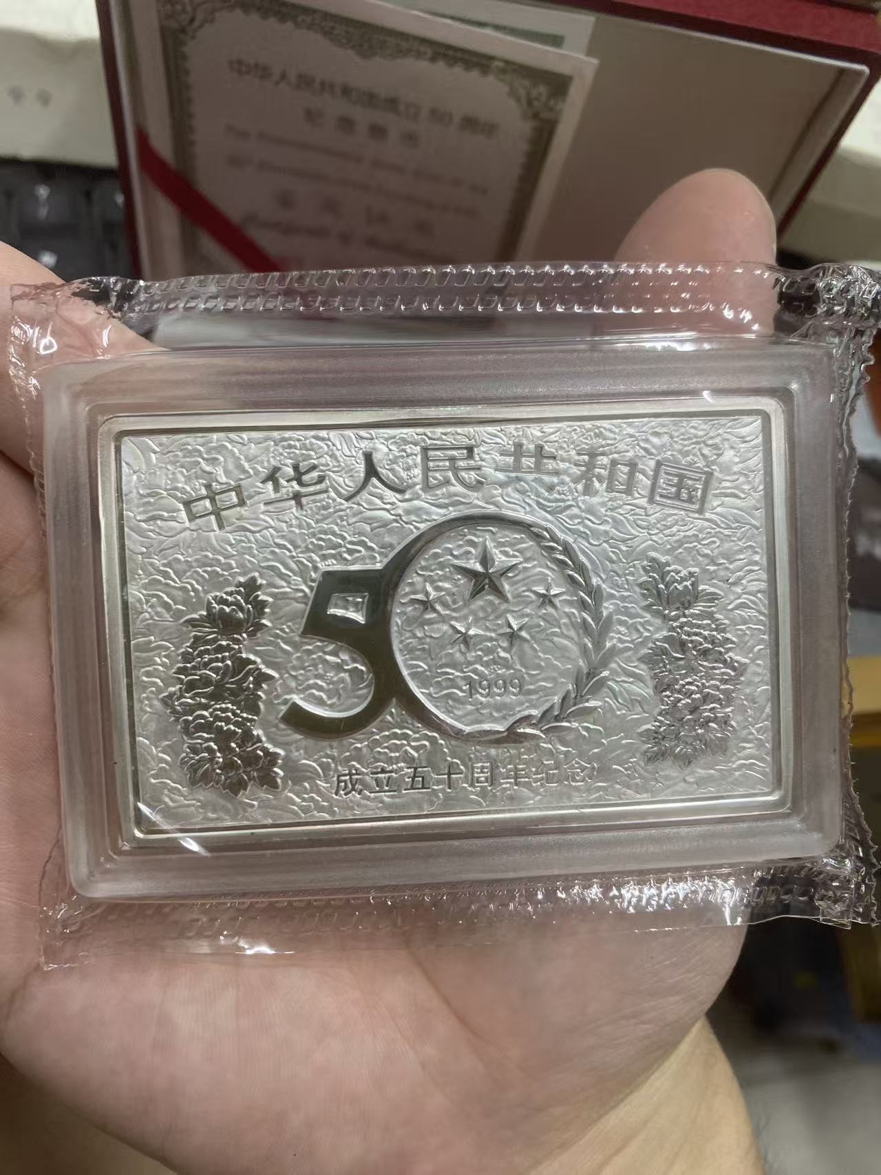 99年建国50周年5盎司银币1套4800元,100克银鋌1枚2800元,前贴撤。