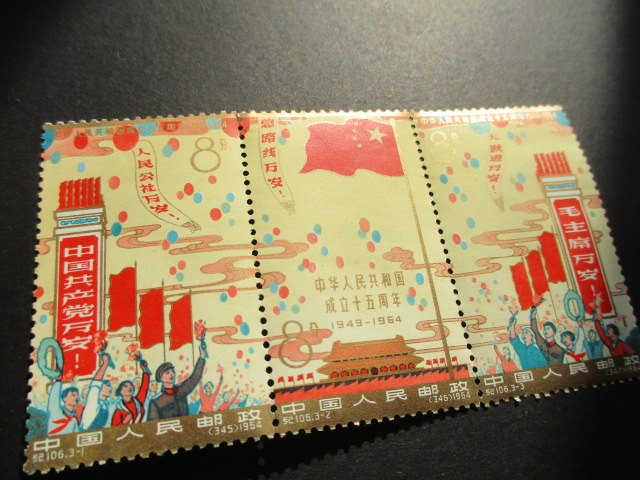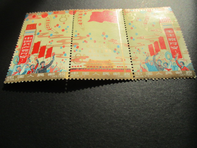 一。建国:上面金粉较亮,下面金粉轻微氧化。齿间折,边纸折在后面粘连。