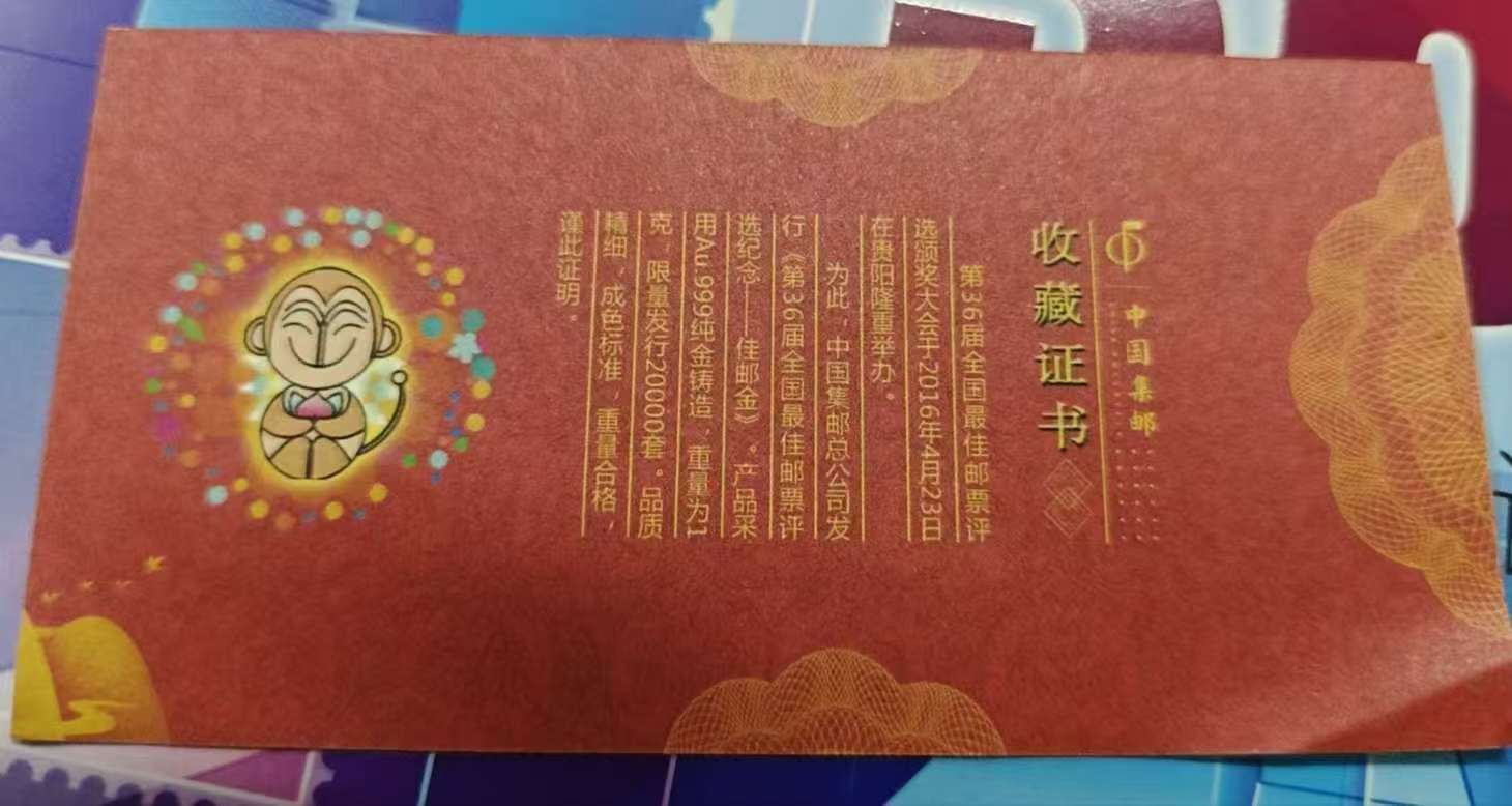 出售第36居全国最佳邮票评选纪念 佳邮金 足金1g 1280元包邮