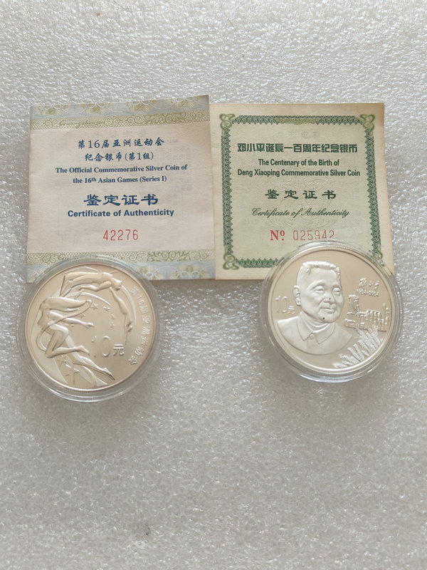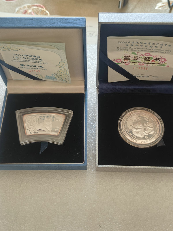 09年16届亚运会1个,04年邓小平1个,10年扇形虎1个,06年加字猫1个,都是一盎司的,都有证书,盒子不全,银价出31.1X4=124.4克X27=3358.8包顺丰