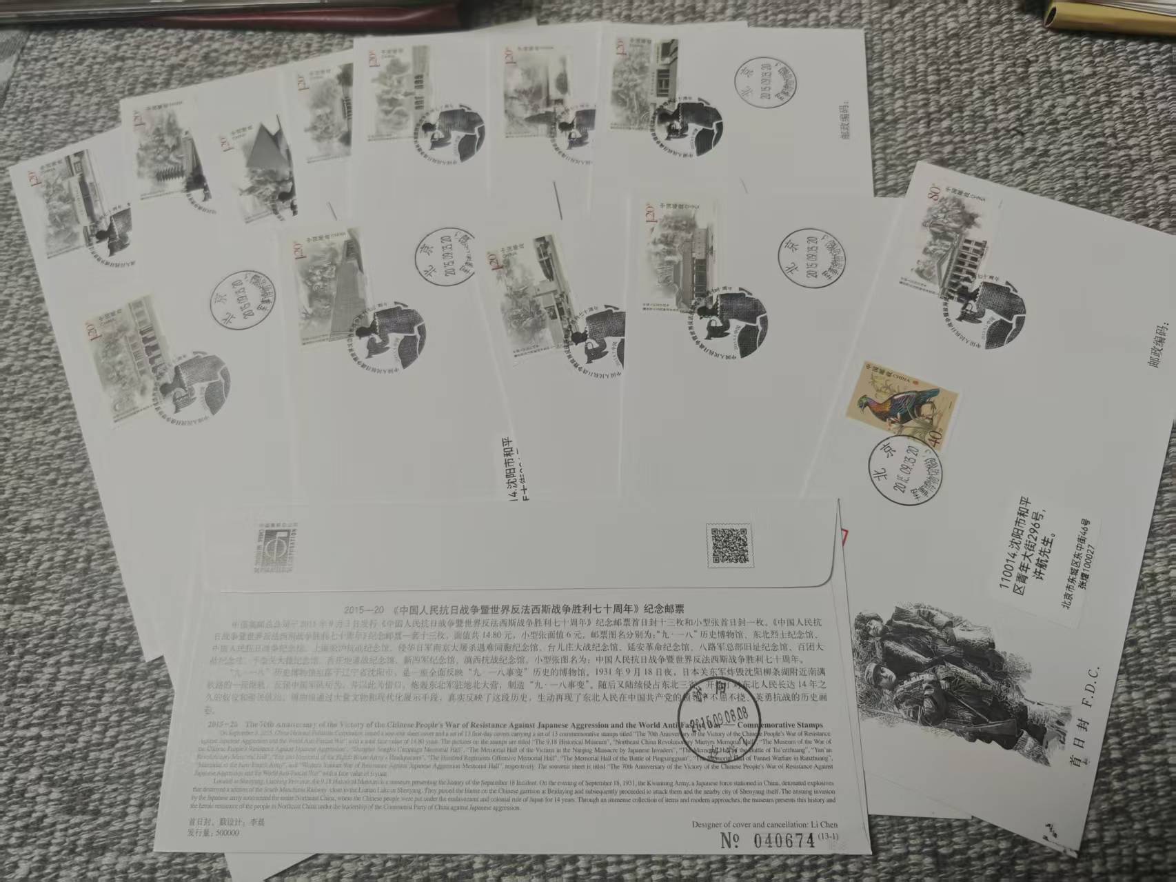 抗日反法西斯70周年,北京军事博物馆首日实寄一套13枚,60元。
