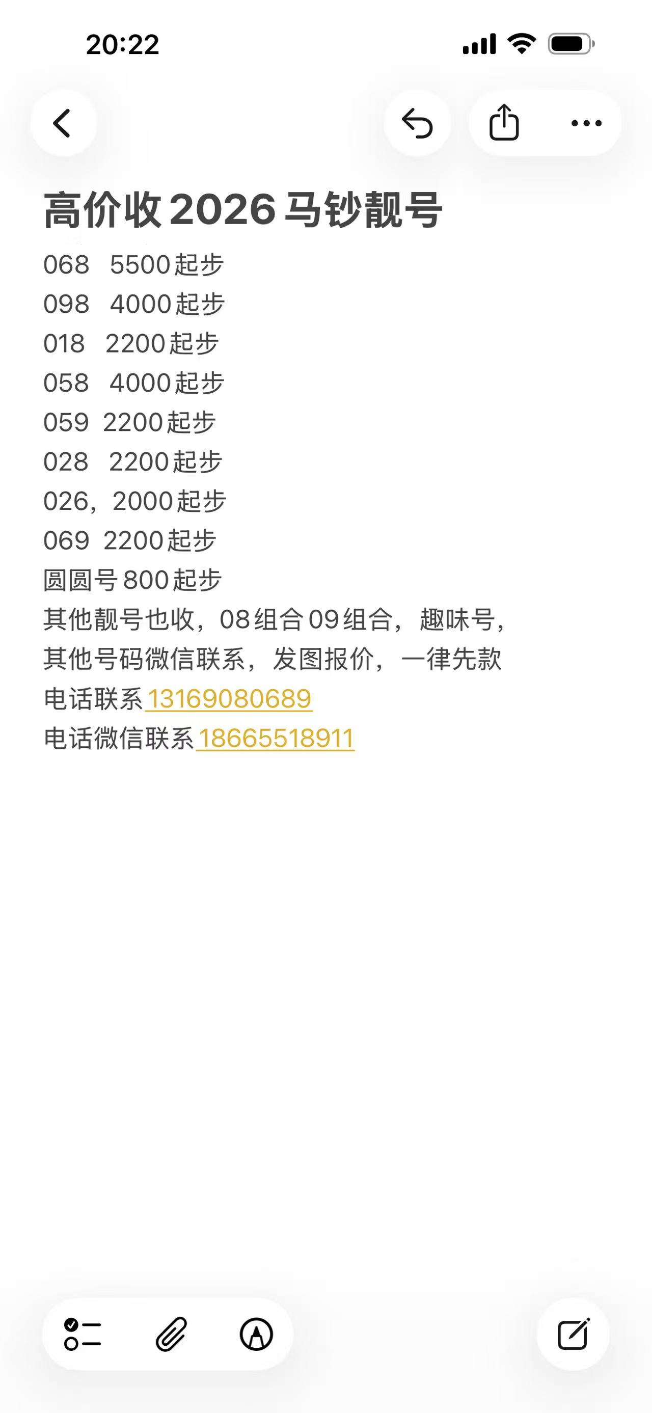 高价收马钞靓号068,098,018,028,058,069圆圆