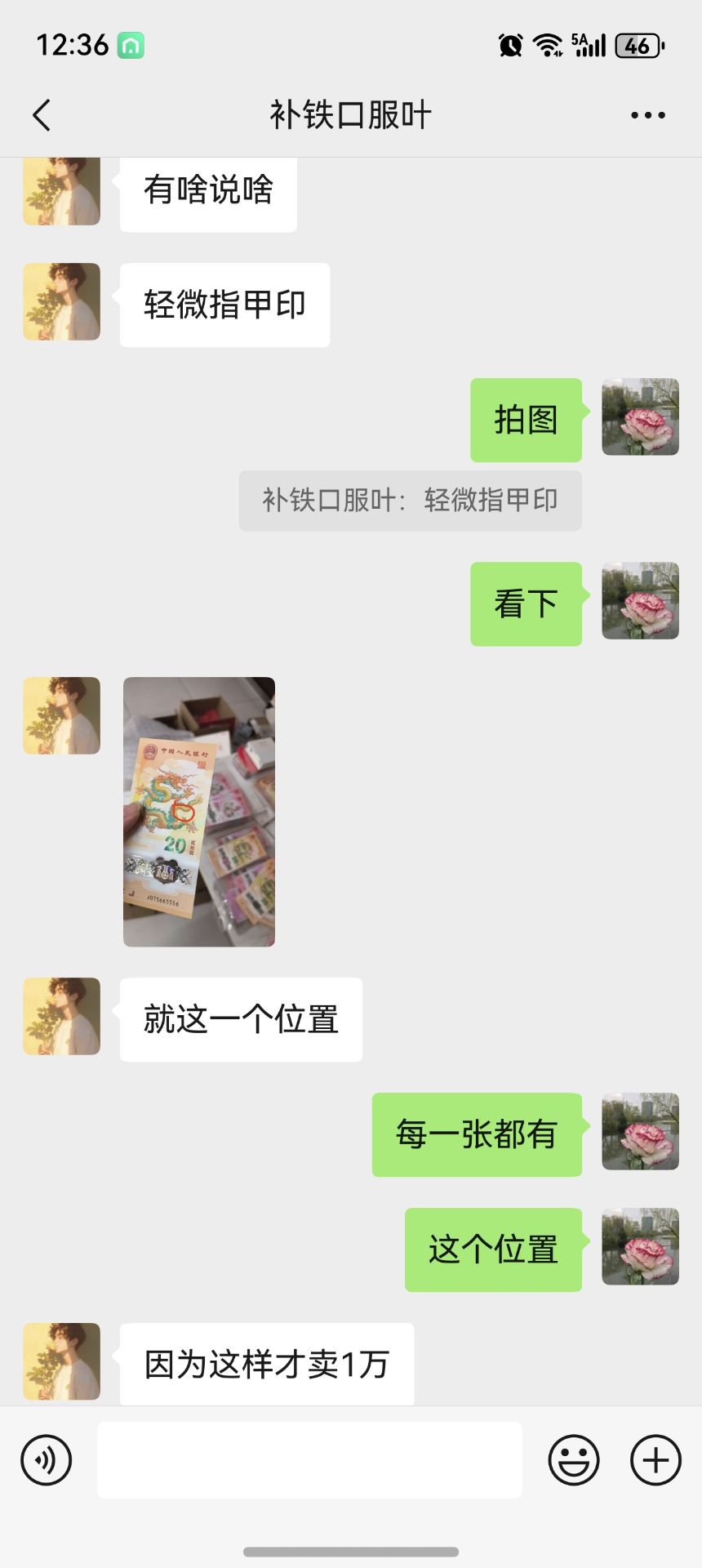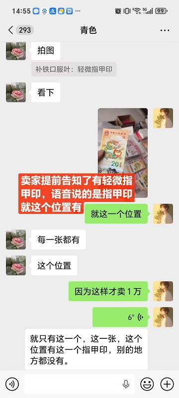 帖子跟帖确认说的很清楚,包品。卖家也跟帖确认了。微信聊天卖家只说尾56这张中间有瑕疵,就发了这一张图,说其他9张都没问题,我才确认的。