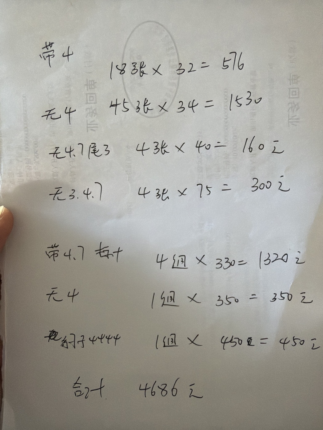 号码在纸上,合计4686元