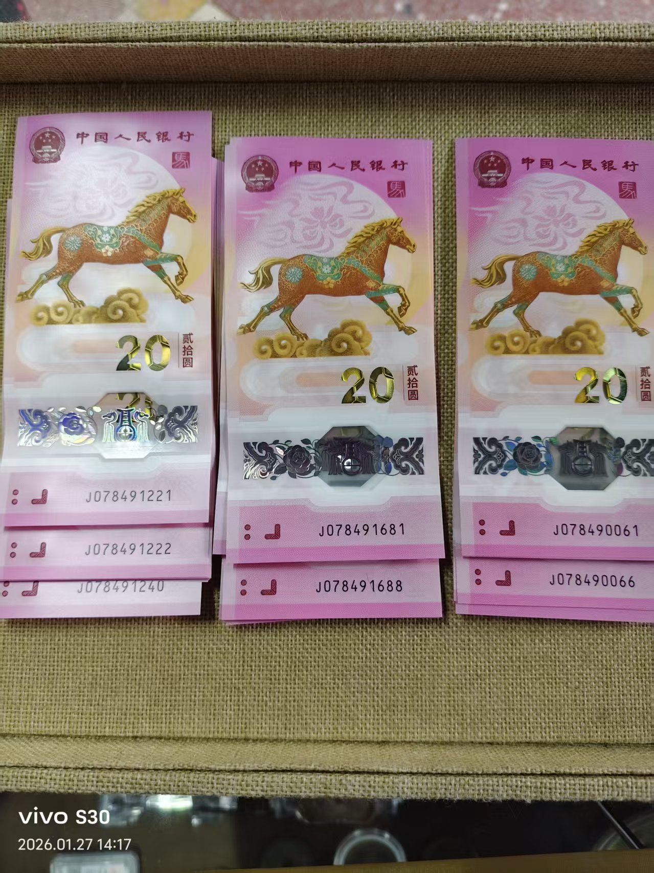 马钞20连J078491221-078491240,含222豹子号售740元,加20连J078491681-078491700含88双尾售670元,另标十J078490061-J078490070一组330元,一起740+670+330=1740包顺丰。