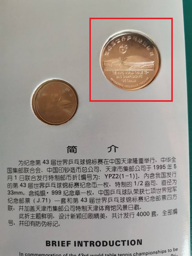 95年43届世乒赛纯银纪念章:1/2 盎司,一个