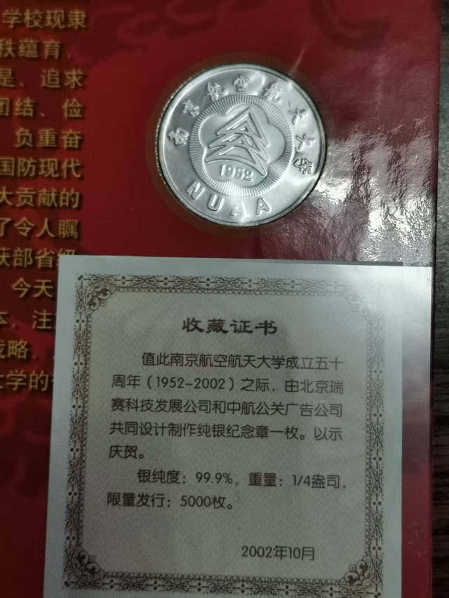 南京航空航天大学成立50周年 纯银纪念章:1/4 盎司,两个
