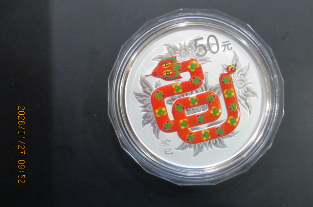 5盎司彩银蛇一枚原盒原证,边齿氧化发红,外壳有点松,售4650元电联确认