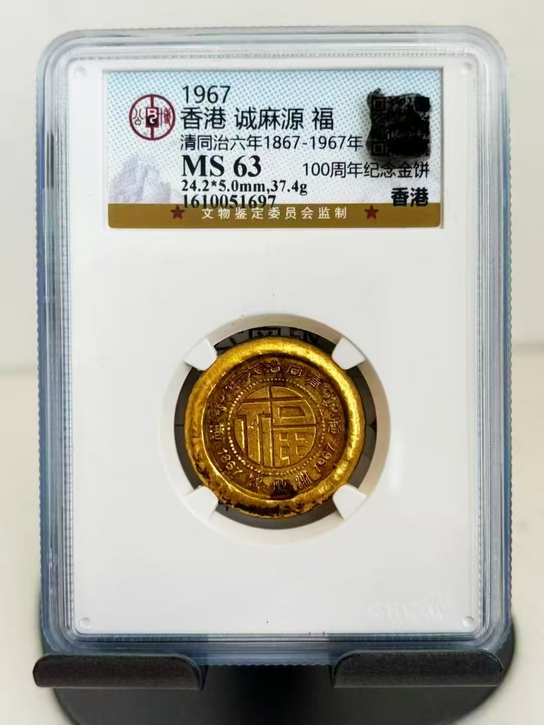GBCA MS63,公博评级,香港老金饼--诚麻源“福”字纪念金饼1个, 37.4克,孤品,45000
