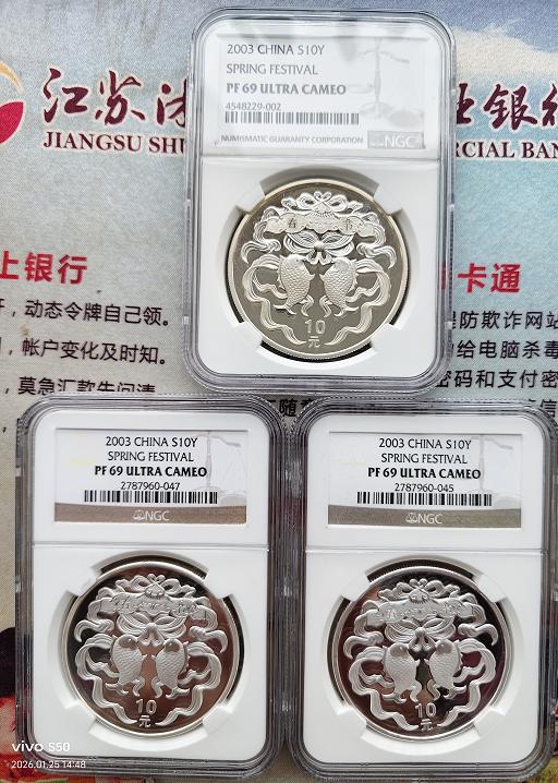 出9枚2003年春节纪念银币,原封、原盒、原证书,全品无氧化。其中3枚NGC PF69评级,1060元/枚,另6枚980元/枚。款到发货,顺丰到付。不常在线,请电联确认。