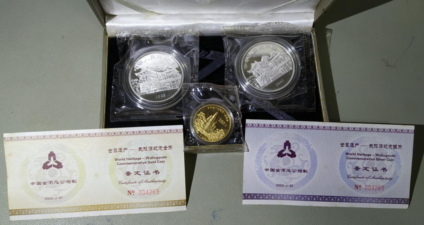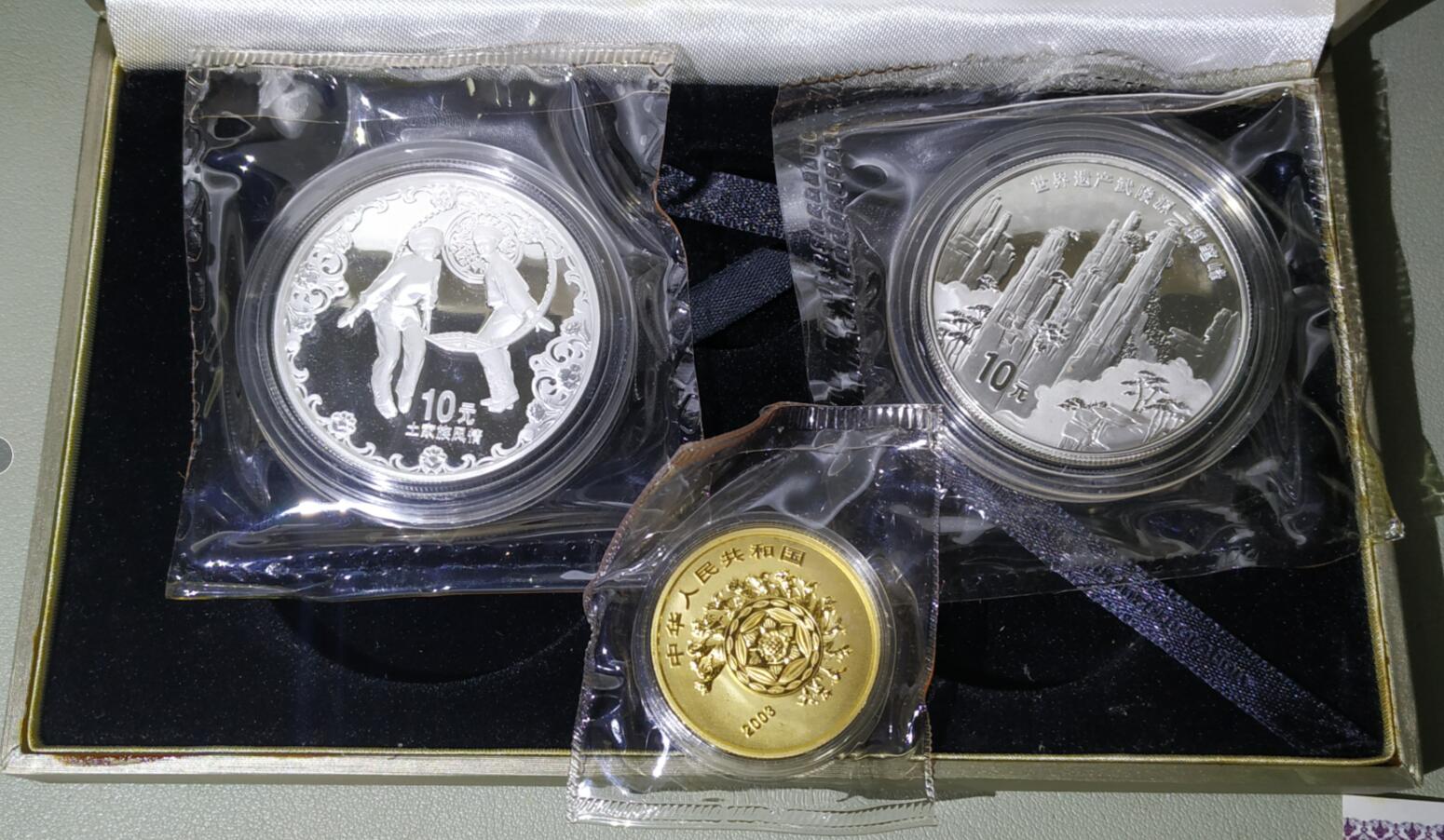 卖2003年武陵源金银币1套,原封全品,金币1/2盎司发行量只有8000枚,银币2枚共2盎司,