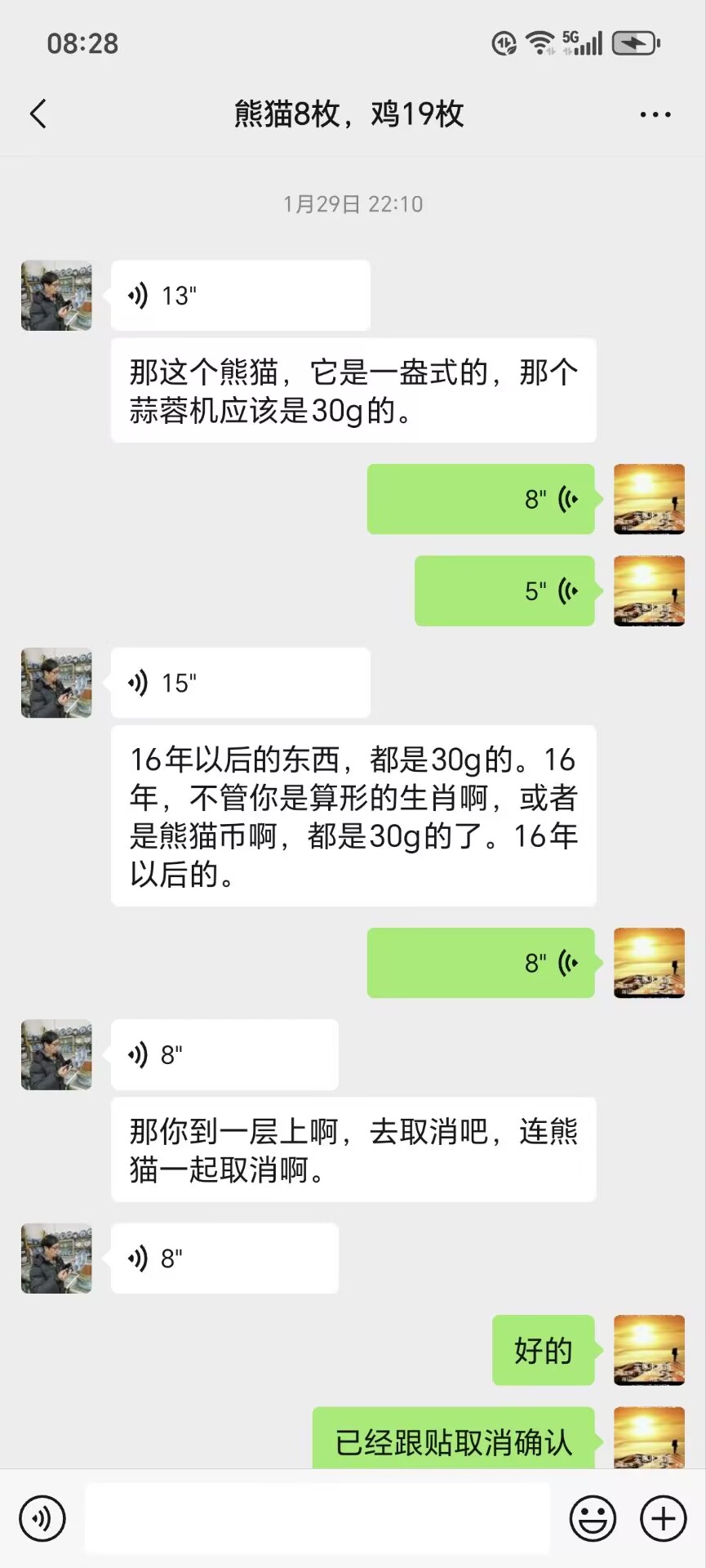 当天,银子大涨,我们都是在按银子价格交易成功,你帖上先确认,然后我跟帖确认,交易成功了,网上都明白,在按银子卖,帖上我没写有证书,看帖你确认后,提出取消确认,我没跟帖同意你取消|确以,网上规定,你确认,我确认的帖,,我不发货,是我违规,我们心里明白,银大跌,说没有证书,或品相又有问题,现在货到了,又不收货,你确认后提出每只鸡要扣30元X19只,等于补你570元,我同意补你570元吧,说句实话,如果收货时银子大涨,你挣多了,也不会分点给我,你我帖上确认,银价涨跌无悔,,..