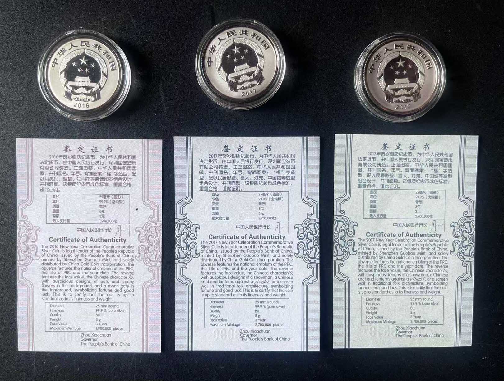 福字银币3枚!2016年1枚,2017年2枚,品相完好,售价:240元一枚!