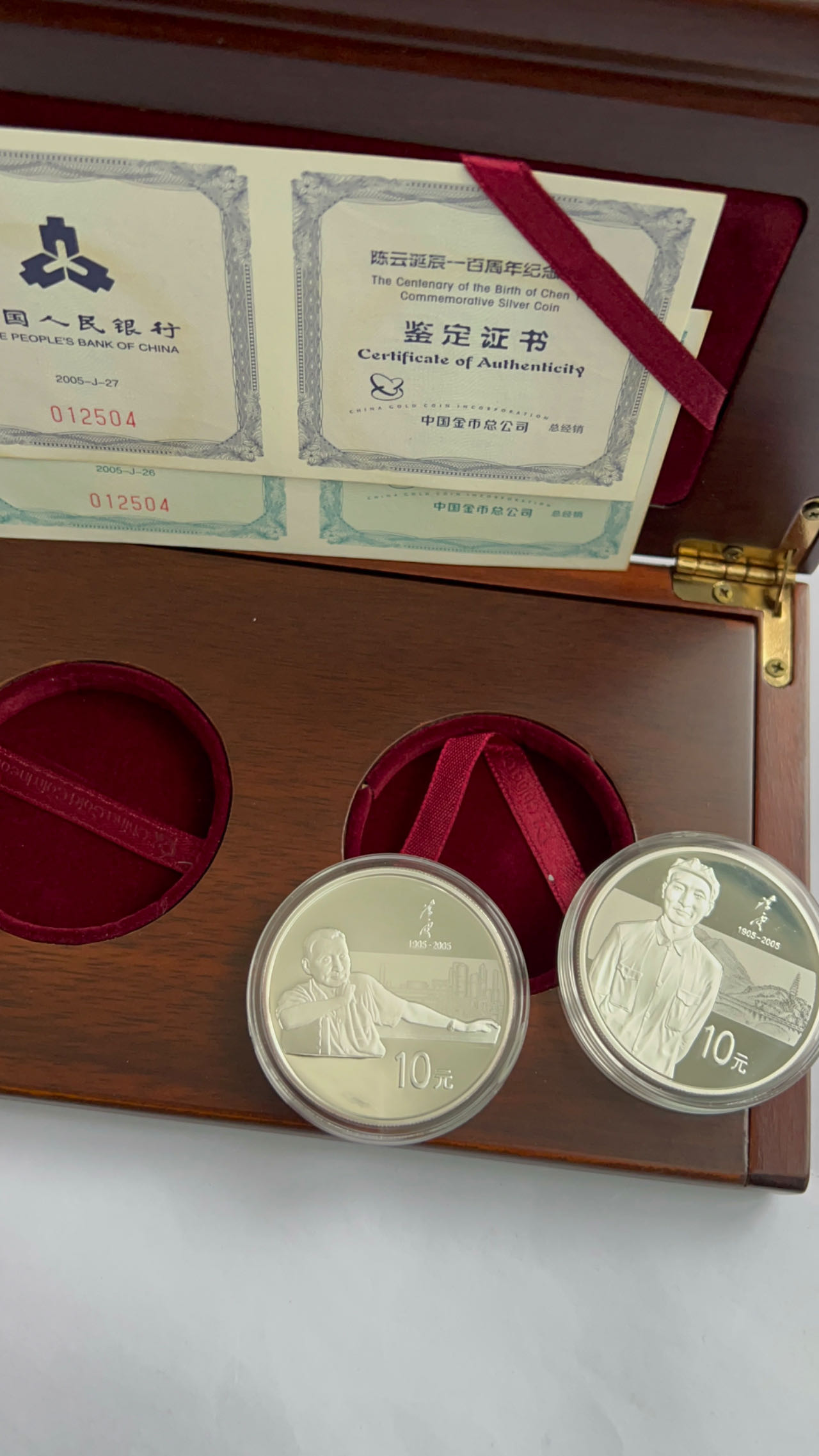出售05年陈云银币(精制)一套(盒证齐全)