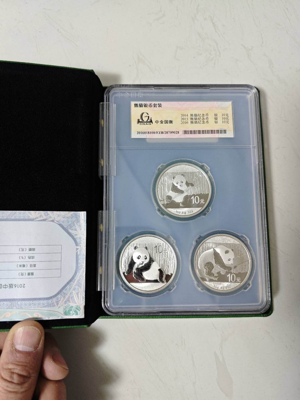 → 熊猫银币精装盒三枚。