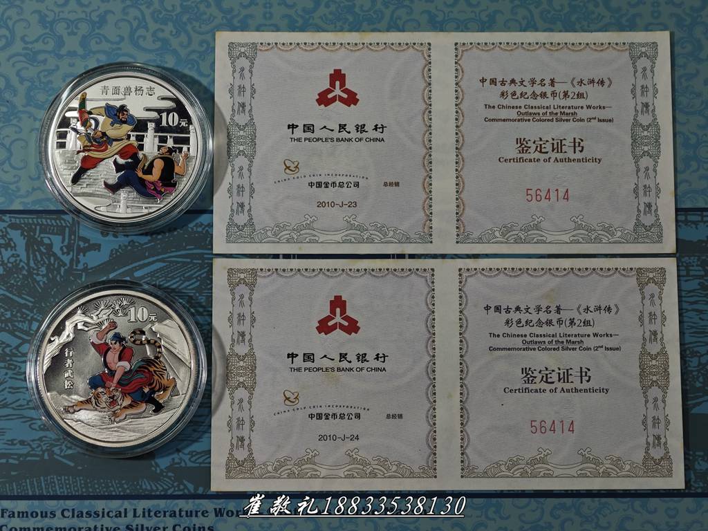 如题,2010年水浒传第2组银币1套2枚,价:1850元包快勿议,原装外盒证书小黄,币正常微氧化略有点点微斑状态