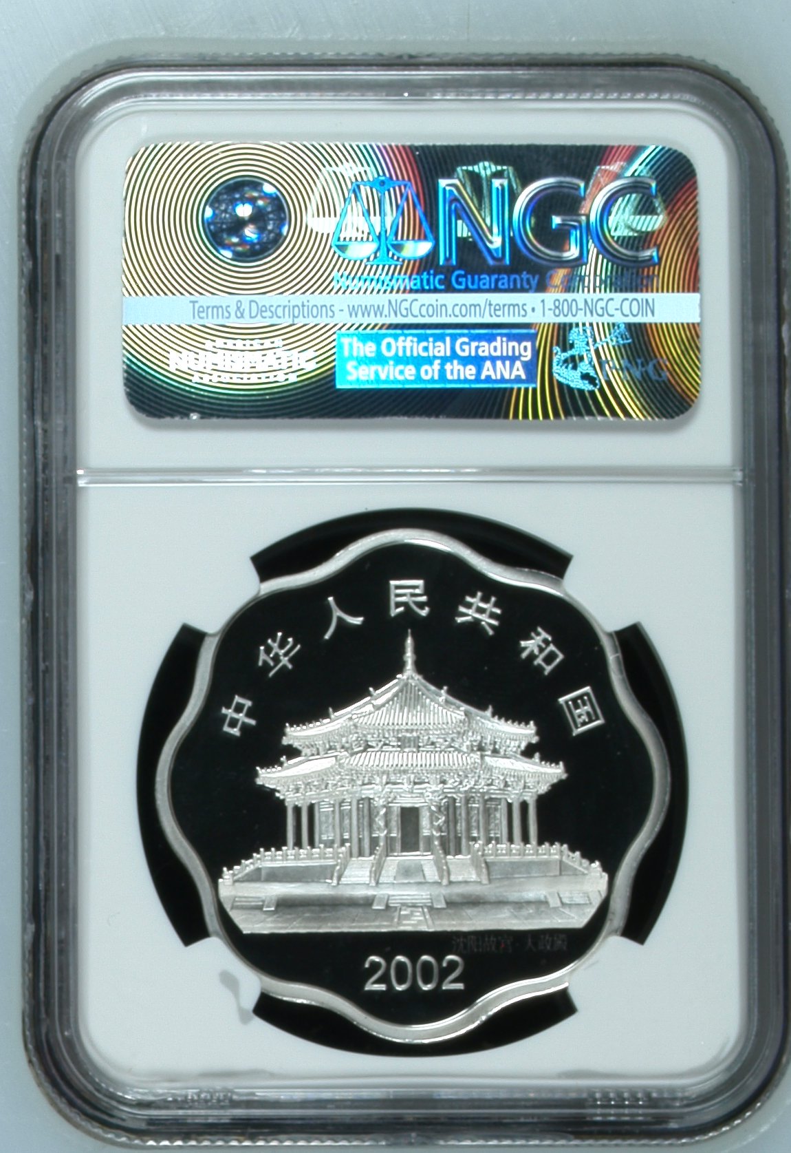 2002年梅花形生肖银马,正面沈阳故宫大政殿,背面一匹奔马图,
