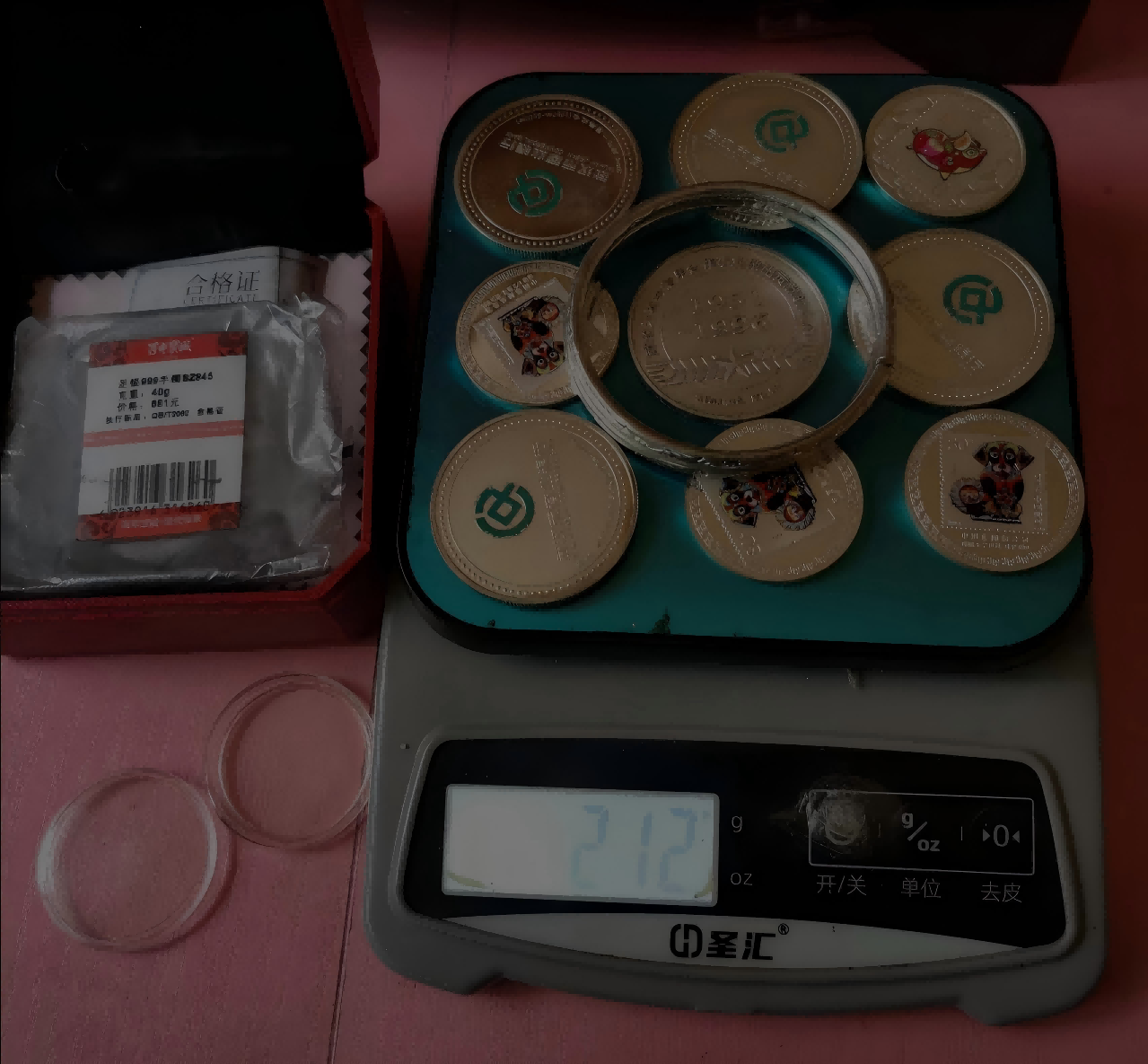 25元/克价卖,25*212克=5300元。保真包顺丰快递!银手镯一对(内径54MM),有证书有盒,其它只有简易包装,由于行情变化快,售出非假不退。