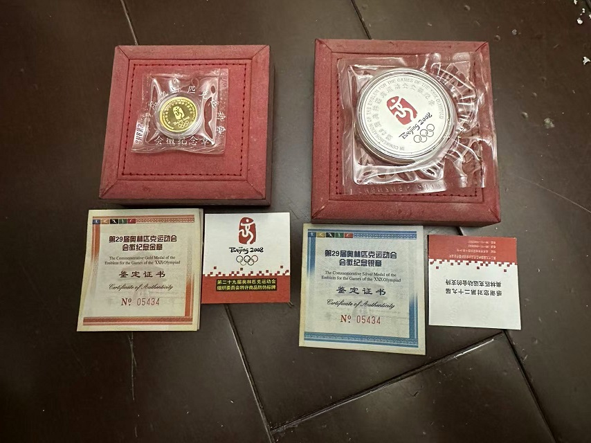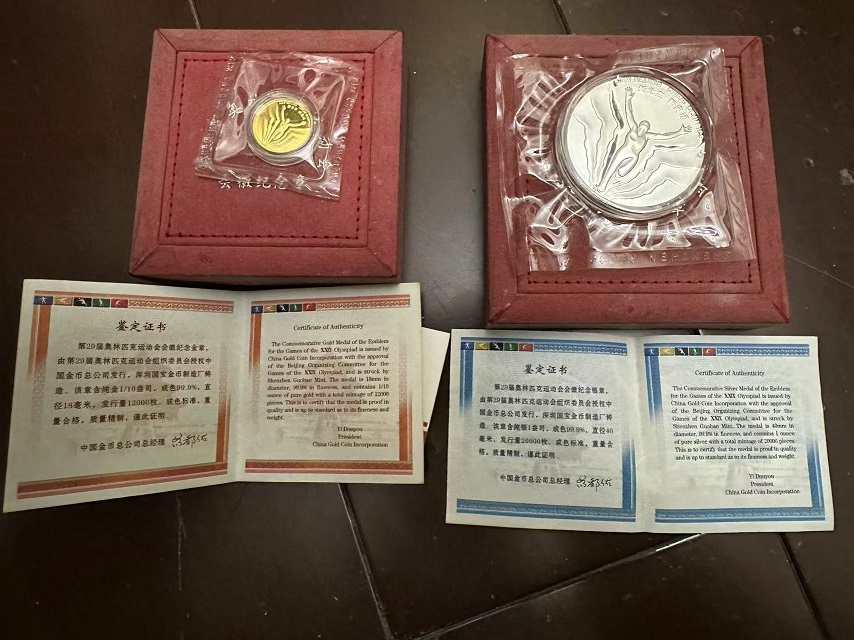 第29届奥林匹克运动会会徽金银纪念章各一盒,发行量12000套(极为稀少),金:1/10盎司;银:1盎司。一起走合计4300元,微信13807109407