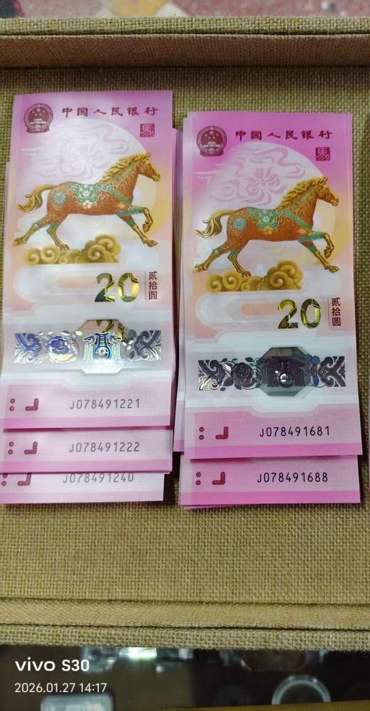 马钞20连J078491221-078491240,含222豹子号售710元,加20连J078491681-078491700含88双尾售640元,不单一起710+640=1350包顺丰。